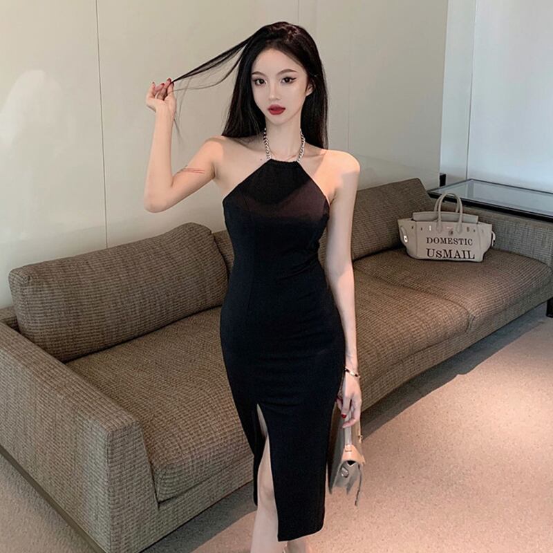 2022年の新しい夏の女性の気質セクシーなオフショルダーブラックスリムミドル丈チェーンホルタードレス micat46883208033