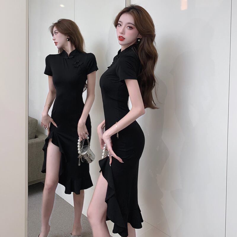 黒のチャイナドレスの若い夏の気質は、中国風の毎日のセクシーなスリットミドル丈フィッシュテールドレスを改善しました micat49599304979