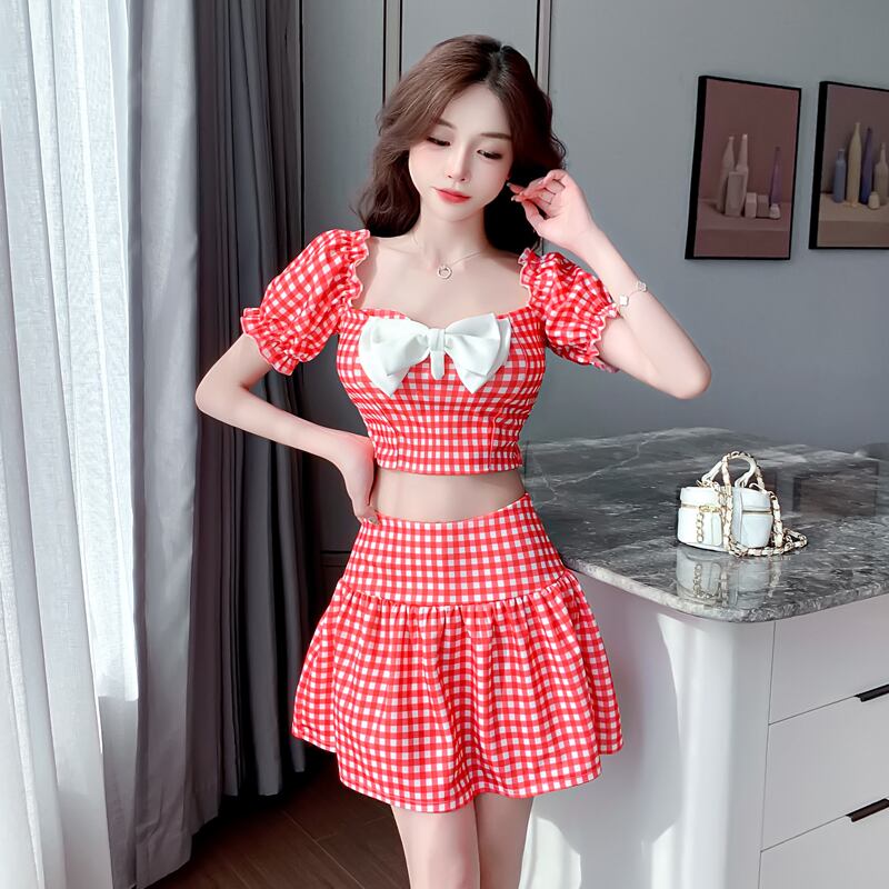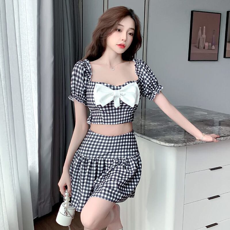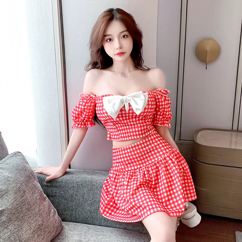 ナイトクラブの女性の技術者の作業服スーツセクシーな格子縞の短いへそトップ+短いスカートのツーピースセット micat33626302953