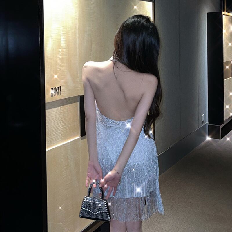 イブニングドレススカートライトラグジュアリーニッチハイエンド重工業スパンコールフリンジバンケット気質セクシーな背中の開いたホルタードレス micat67891076685