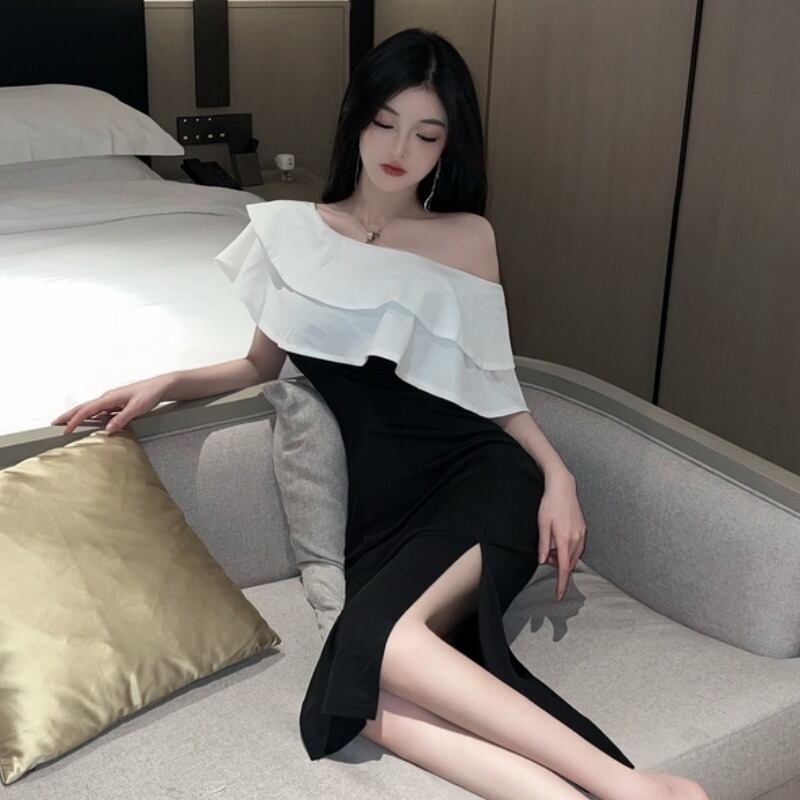 フランスのイブニングドレスロングドレスナイトショップ女性の宴会気質自己栽培セクシーなフリルワンショルダードレス micat66178906970