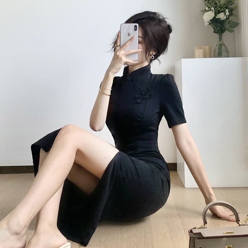 中国のチャイナドレス2022年の新しい若い気質のハイエンドレトロな黒の改良されたミドル丈のドレス micat44633838208