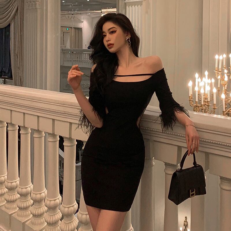 黒のイブニングドレススカートライトラグジュアリーニッチハイエンド気質セクシーなオフショルダーオーストリッチヘアリースリムバッグヒップドレス micat73098029006