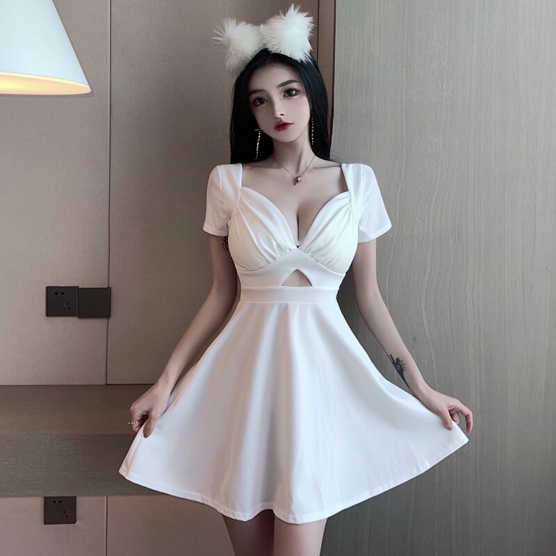 ナイトクラブの女性のセクシーな作業服は、ローカットの深いVネックウエストスリミング半袖ふくらんでいるドレスをくり抜いた micat64673964730