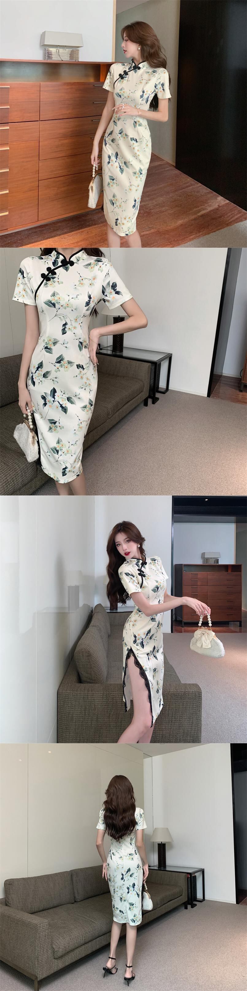生放送服ポジェニック女性アンカー服レトロプリントレースセクシースリット改良チャイナドレス micat1698320000