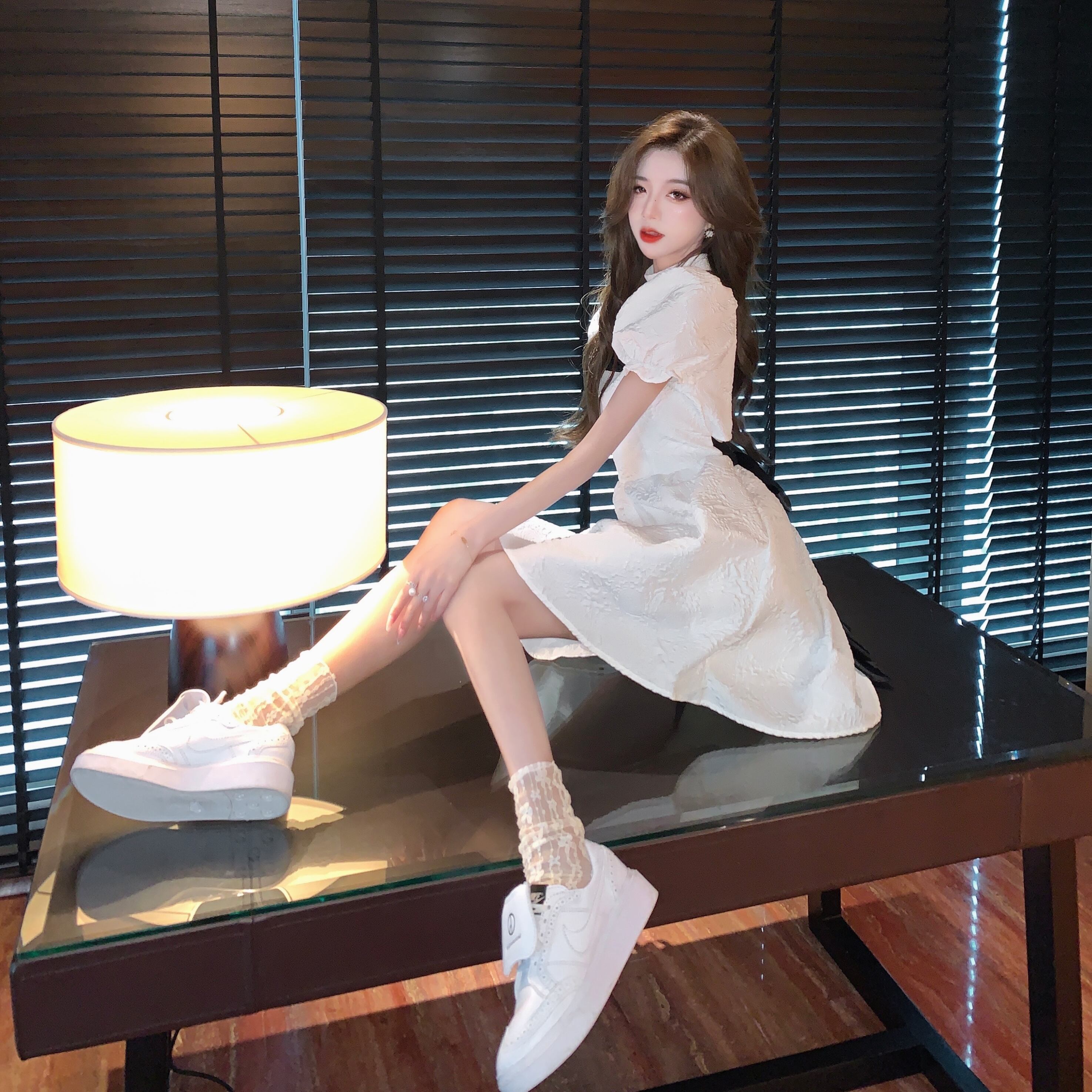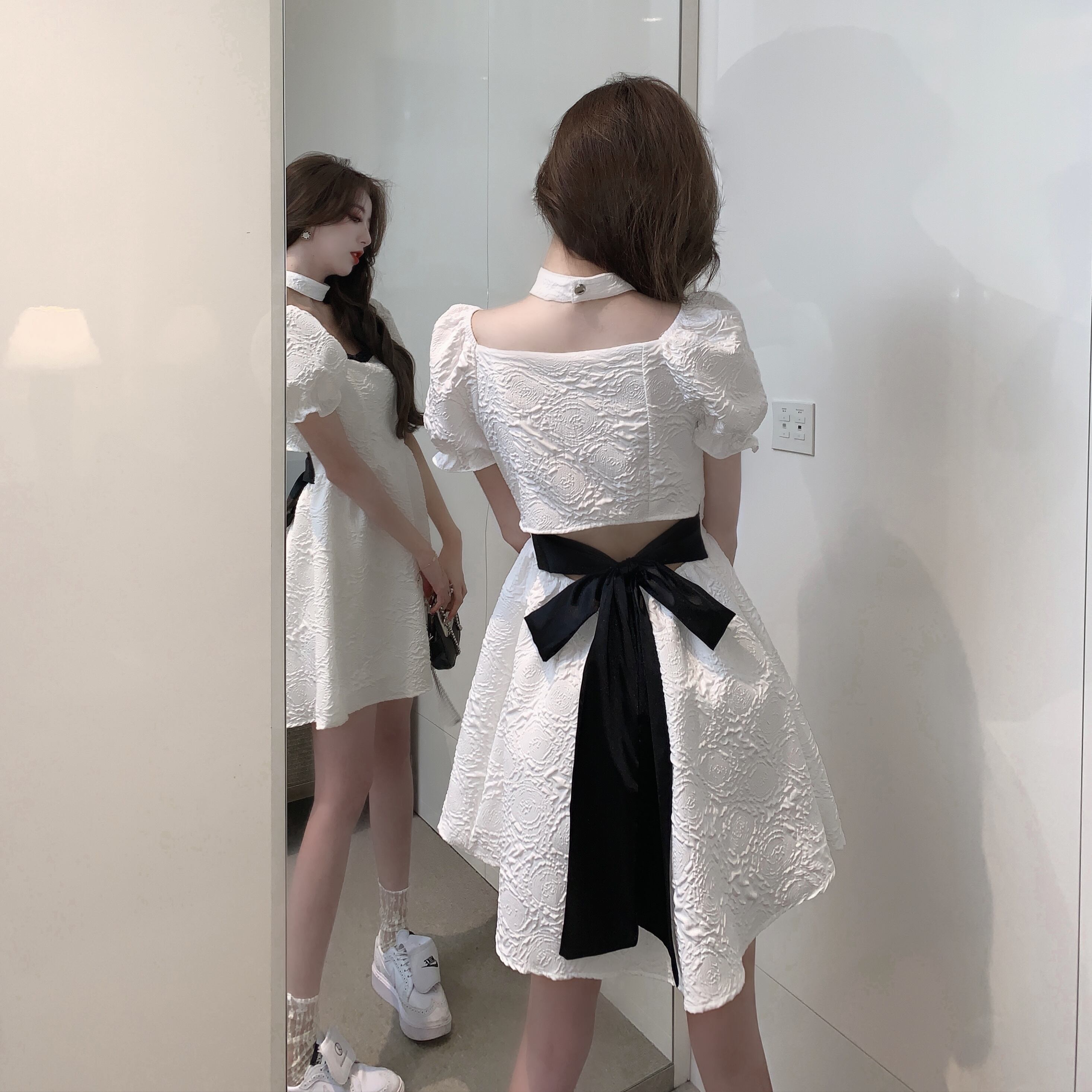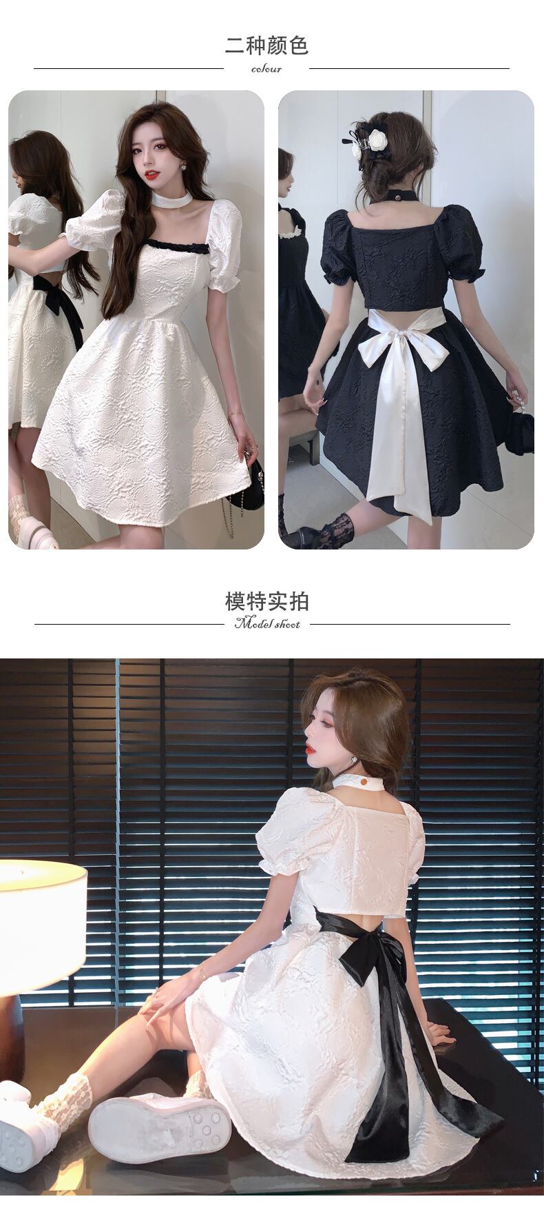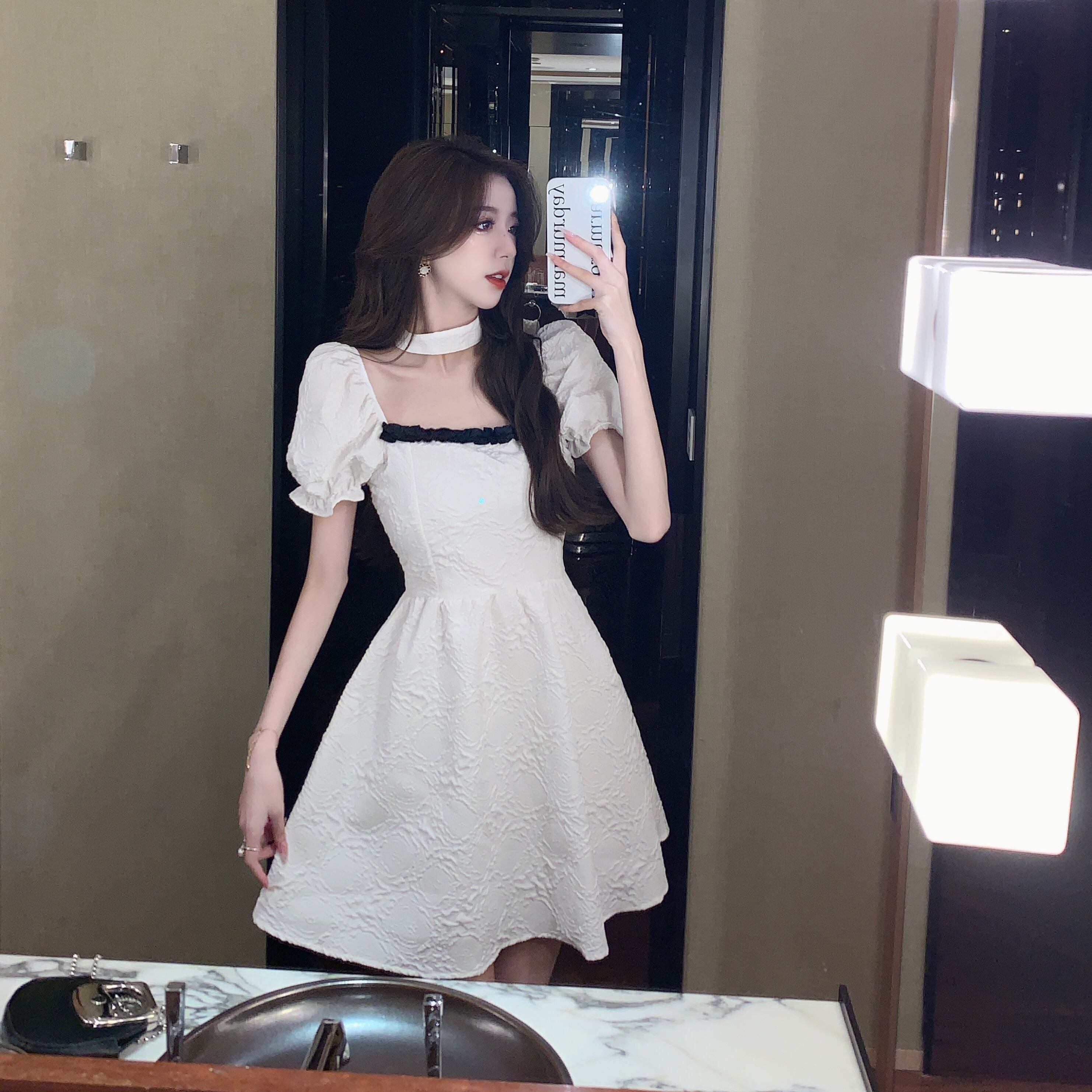 フランスの甘い塩のドレス女性の夏のハイエンド気質ヘップバーンスタイルのセクシーなスクエアネックパフスリーブAラインスカート micat76200207360