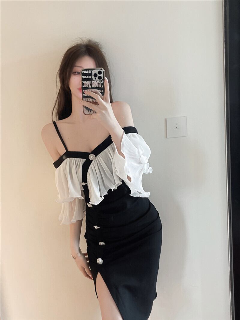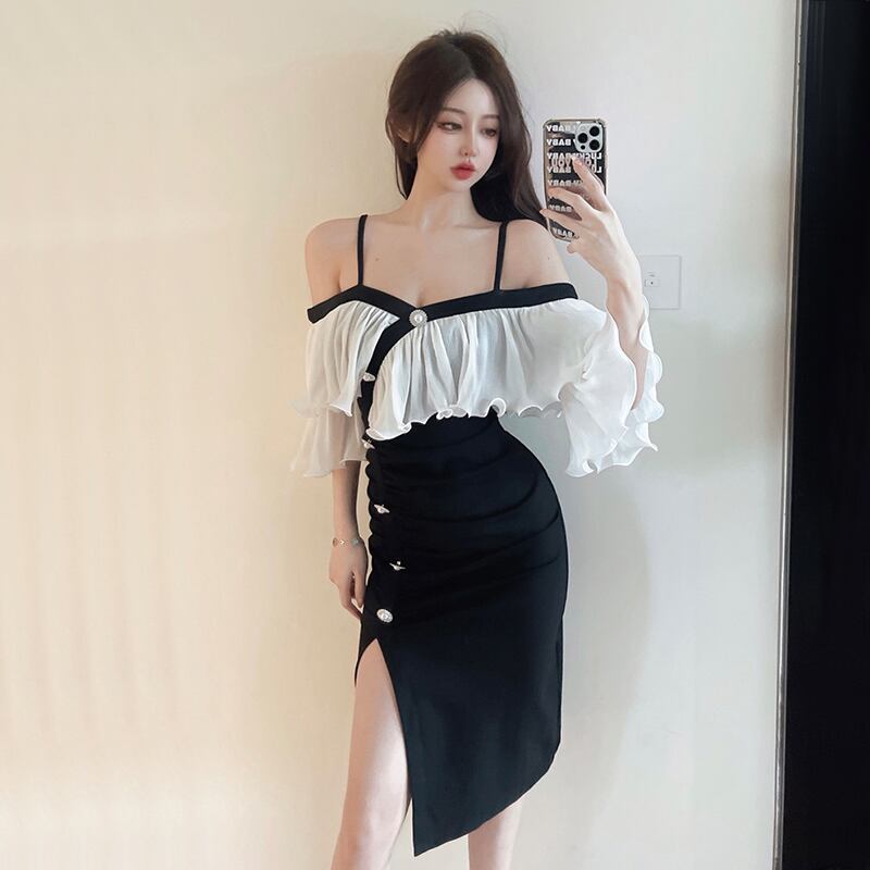 ヘップバーンスタイルのイブニングドレススカートフェミニンな気質ライトラグジュアリーニッチハイエンドフレンチセクシーな見事なワンショルダーサスペンダードレス micat73015336776