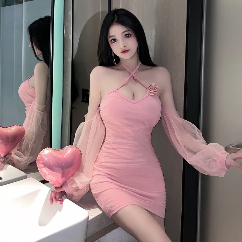 生放送服ポジェニック女性アンカー服ナイトショップスーパーフェアリーランタンスリーブセクシーなローカットVネックストラップレスドレス micat48057413218