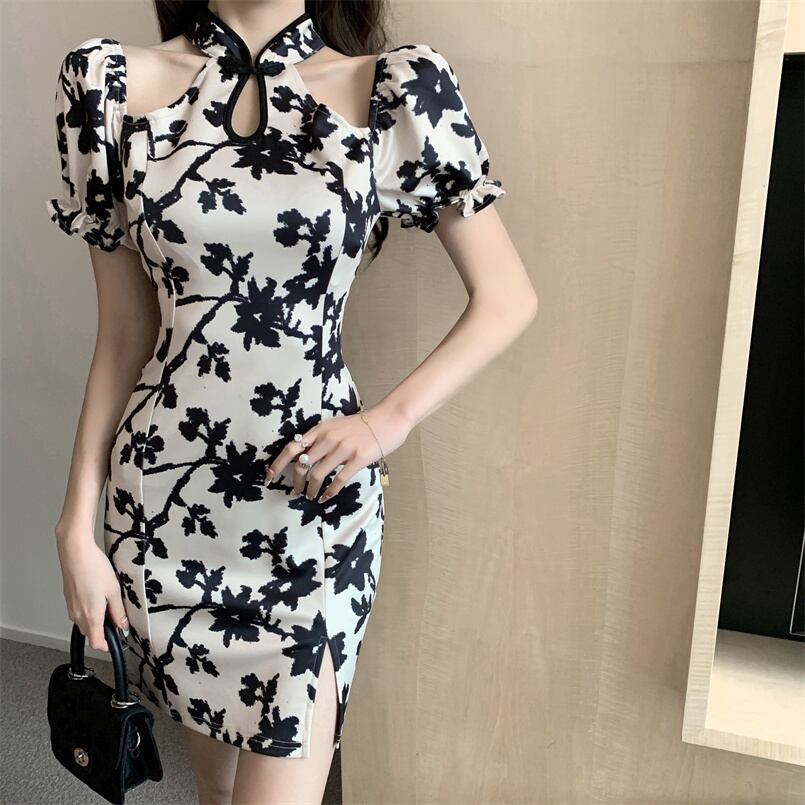 生放送服女性アンカー服フランスのレトロな花柄の若いセクシーなオフショルダーの改良されたチャイナドレス micat46578915707