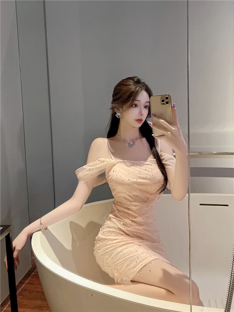 フランスのスーパーフェアリー小さなドレススカート短い光沢のあるメッシュ宴会気質セクシーなワンショルダーサスペンダードレス micat66337928535