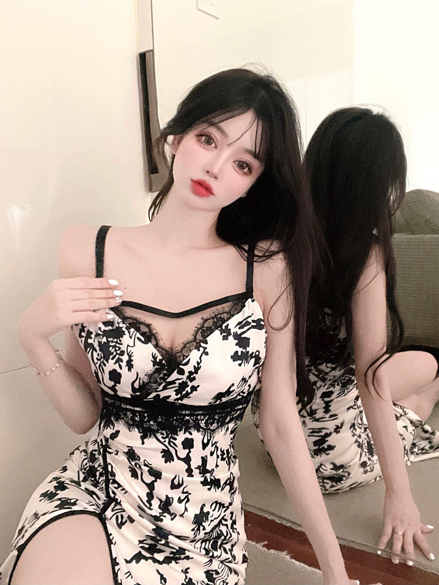 セクシーなドレスの女性の夏フレンチレトロな気質フローラルVネックレースミドル丈サスペンダースカート micat37191584604