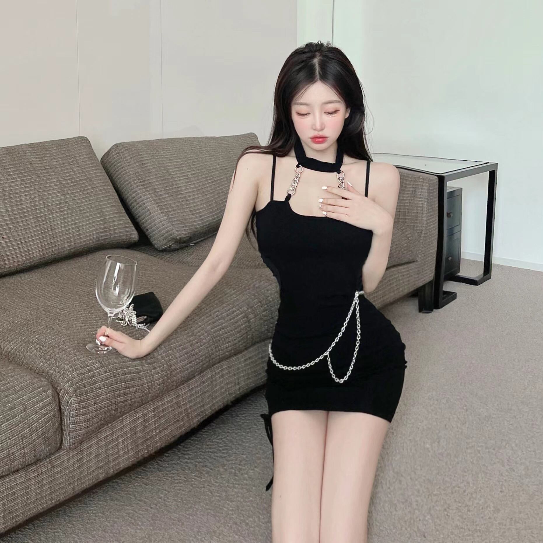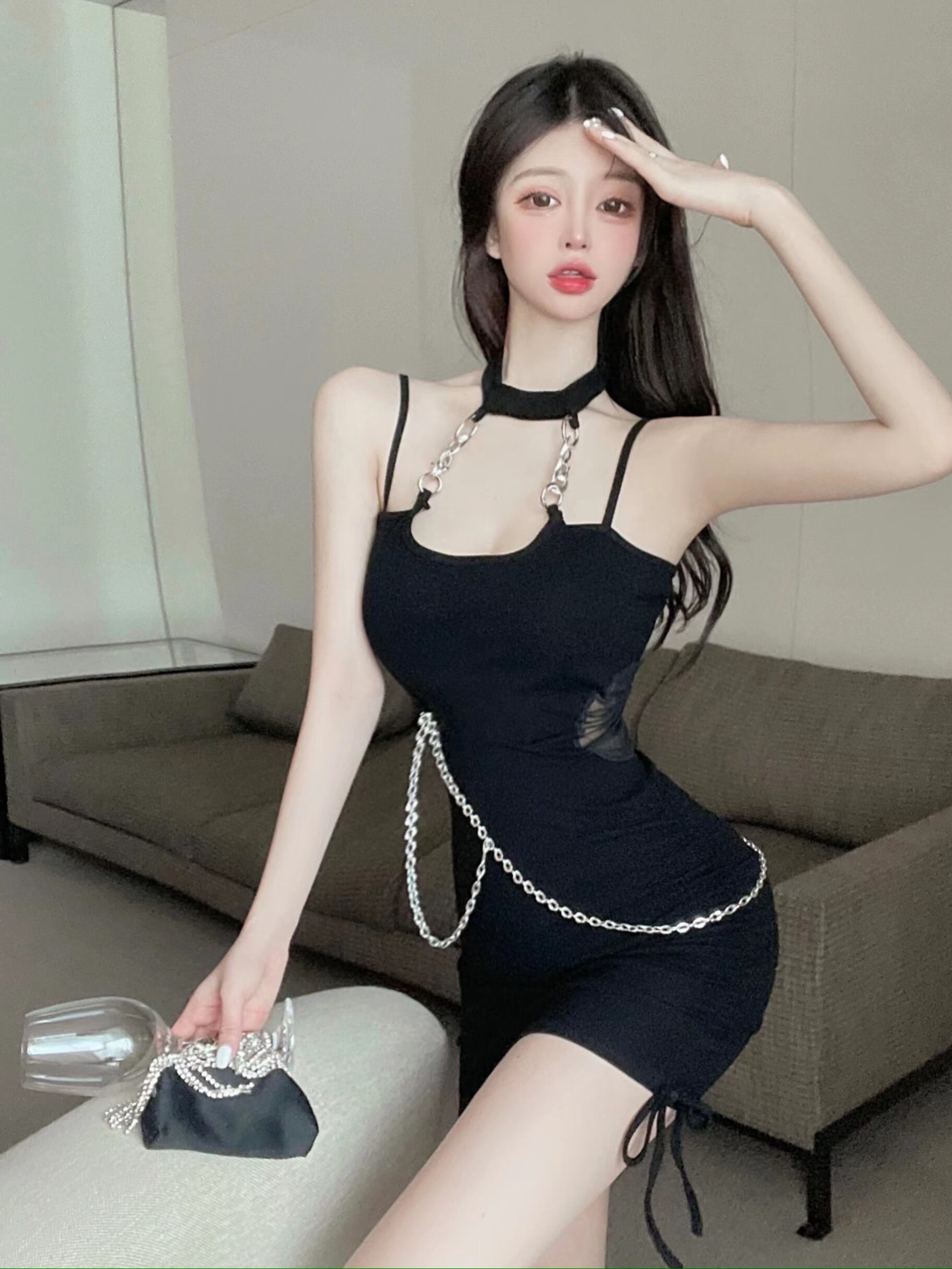 ナイトクラブ婦人服バーダンスダンスママはスカートファッションのセクシーなチェーン装飾をぶら下げ首サスペンダードレスを再生するのを見る micat3695952511