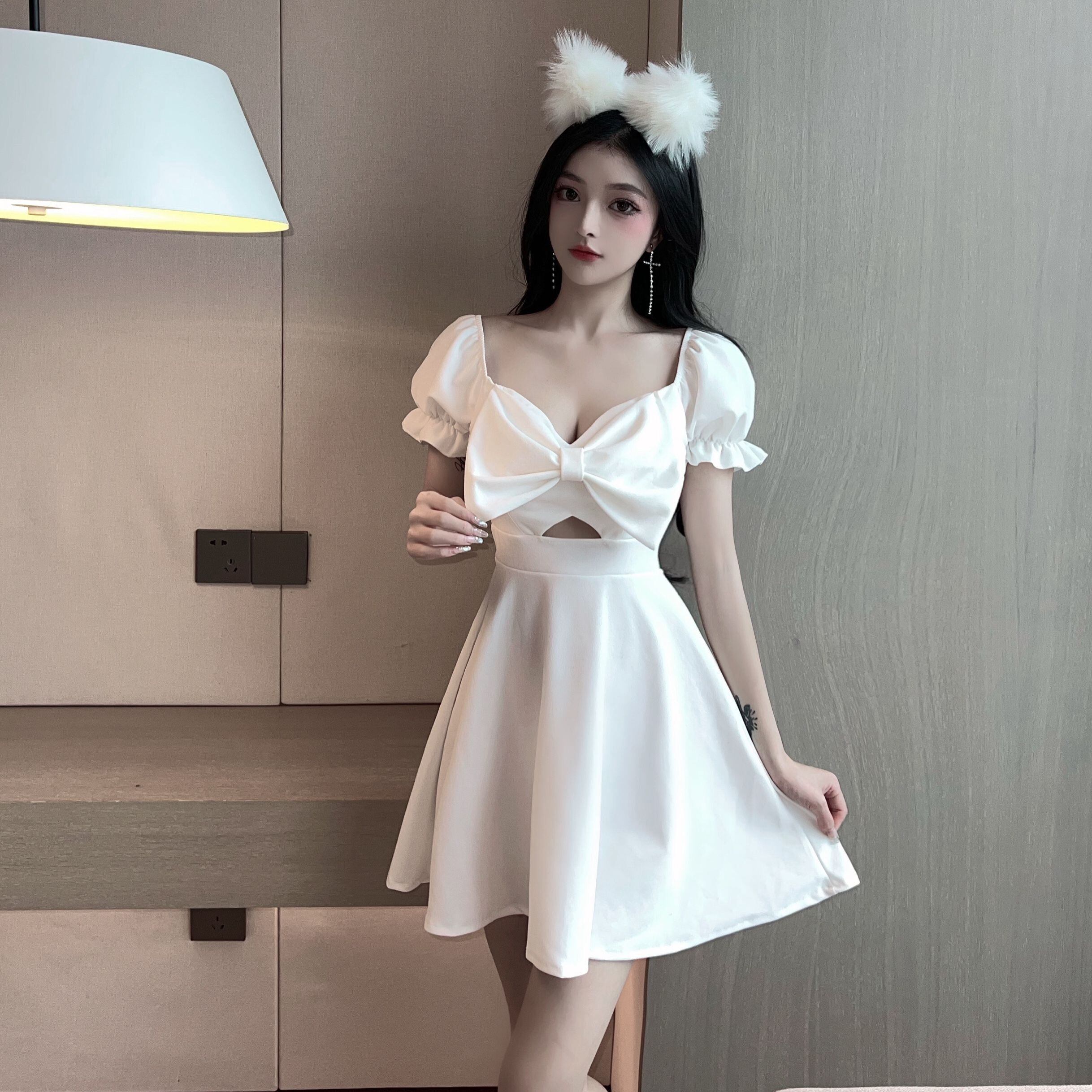ナイトフィールドドレスナイトクラブレディースセクシーローカットディープVネックフレンチパフスリーブウエストスリムパフィースカート micat71565580026