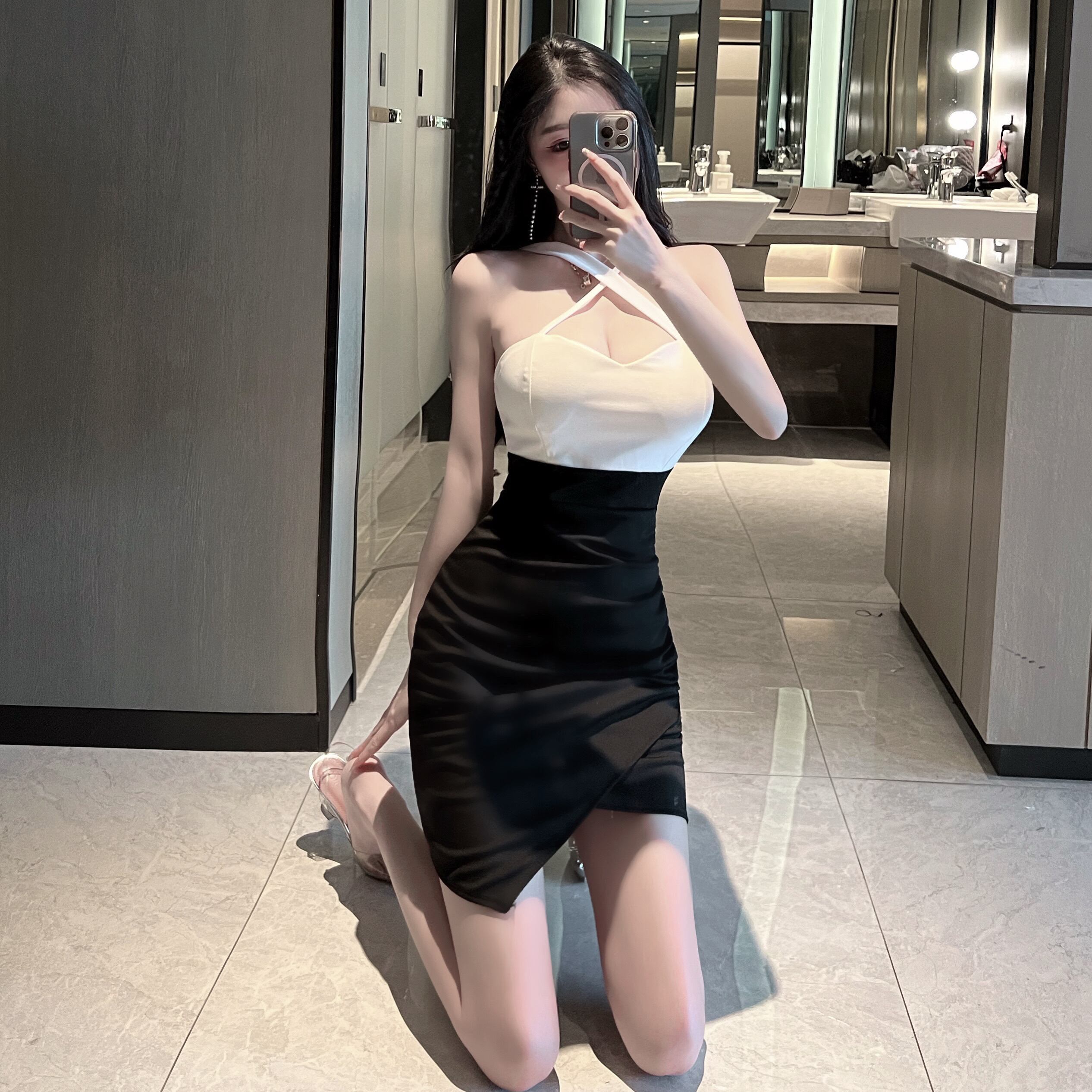 ナイトクラブナイトクラブ女性のセクシーな作業服ローカットディープVネックコントラストカラーバッグヒップクロスチューブトップサスペンダードレス micat72331517605