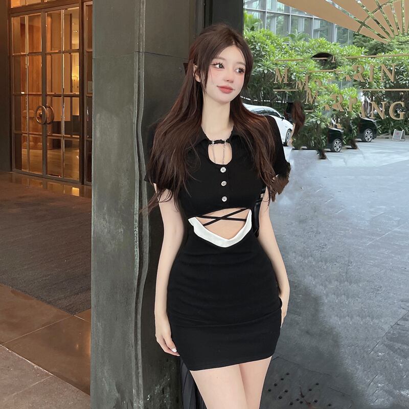 甘くてスパイシーなドレス夏の婦人服2022新しいファッションセクシーな中空アウトウエストPOLOカラーバッグヒップスカート micat81646198195