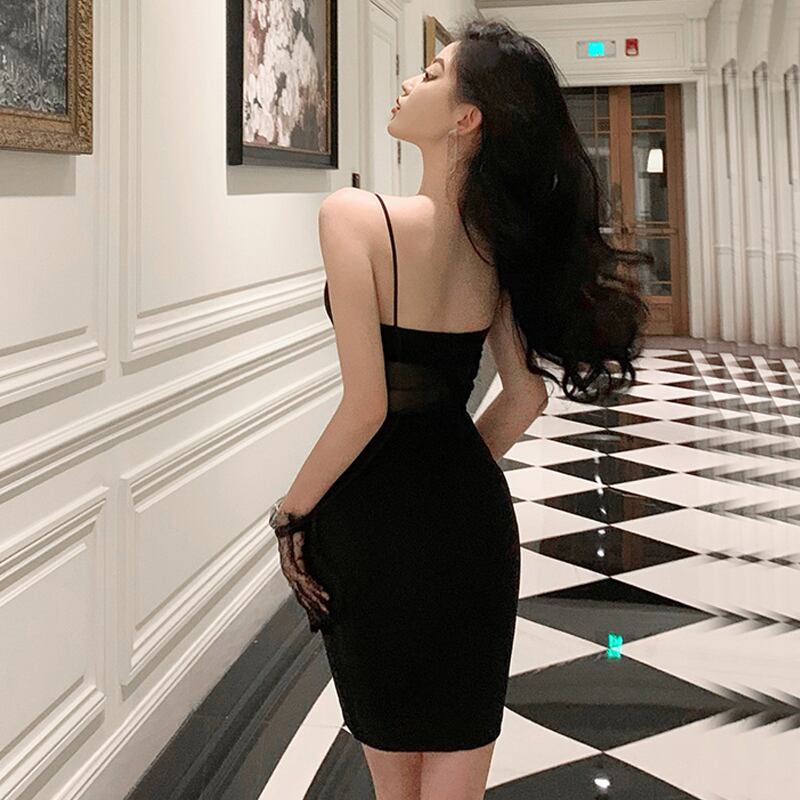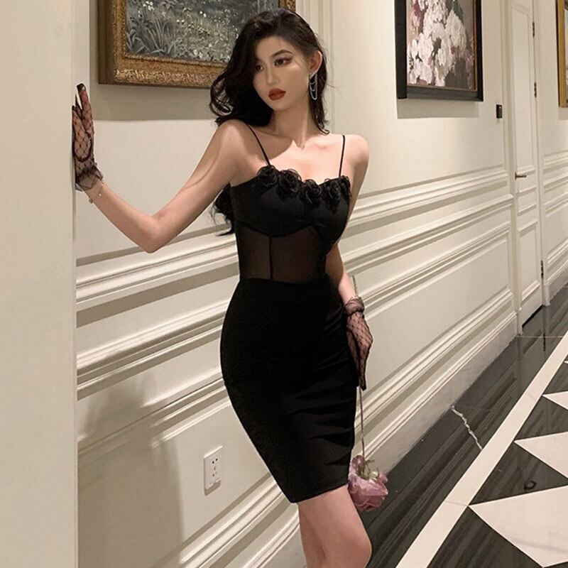 黒のイブニングドレスハイエンドライトラグジュアリーニッチ気質立体フラワーセクシーメッシュステッチショートサスペンダードレス micat56091049945