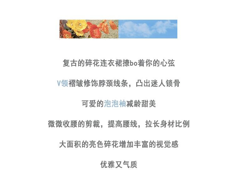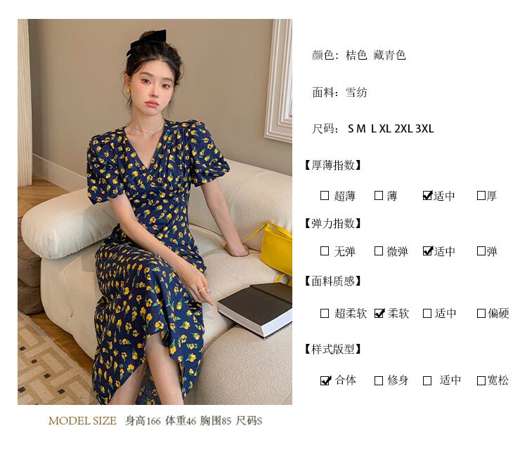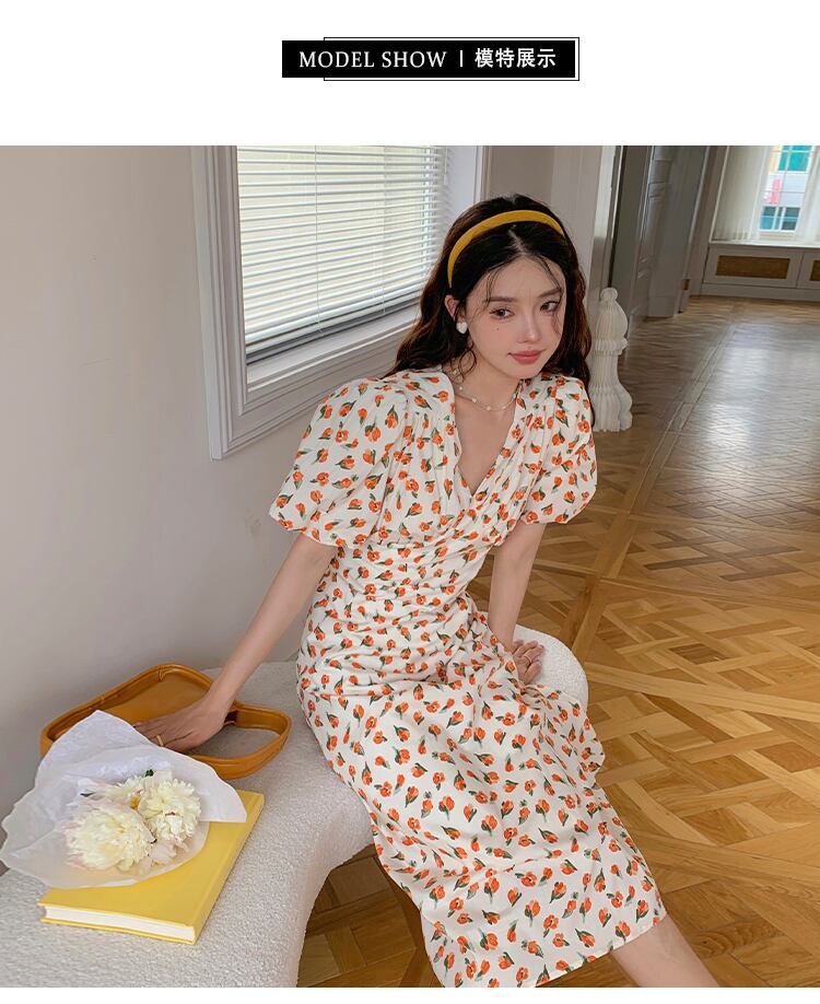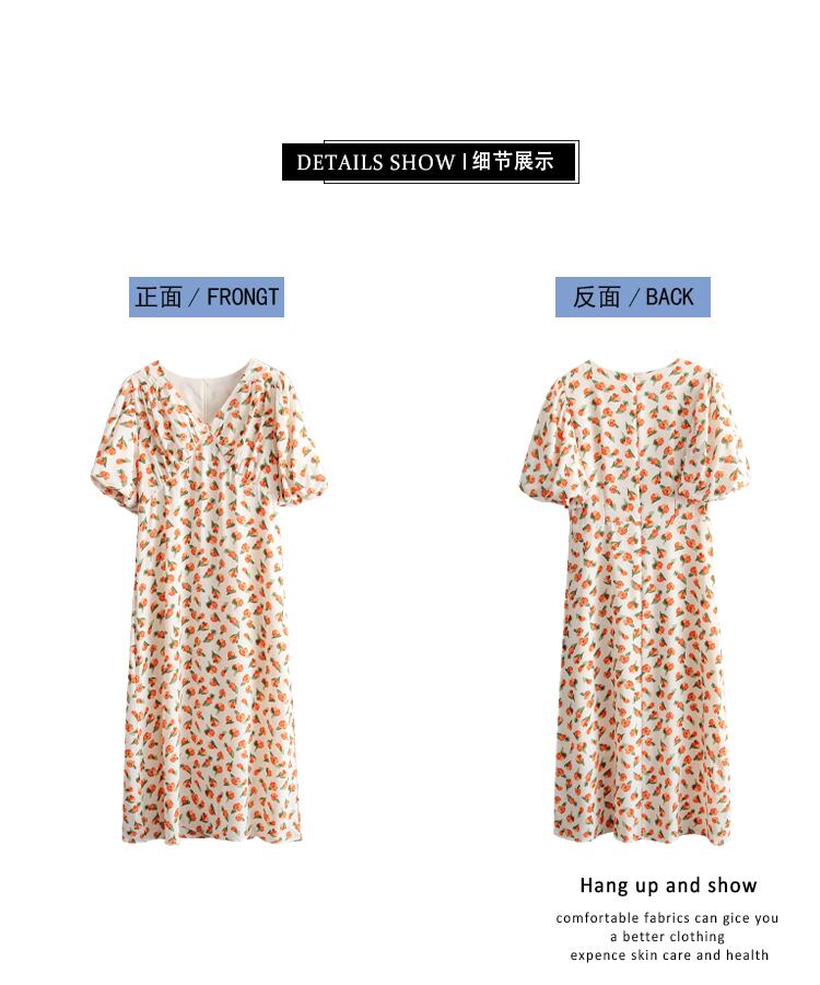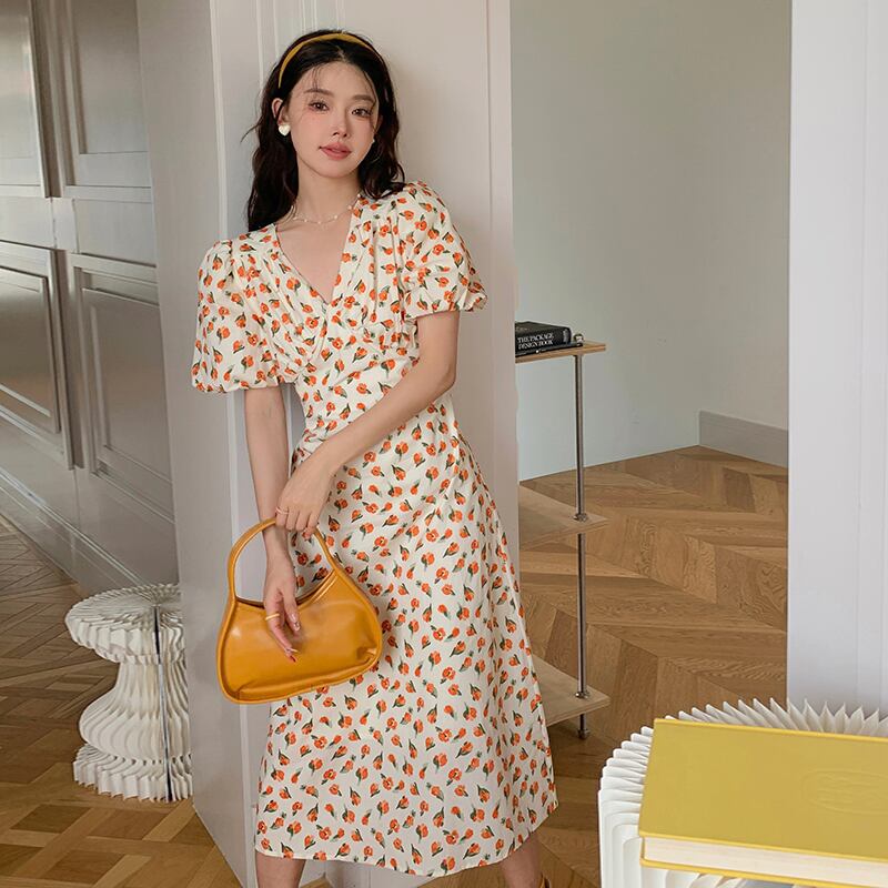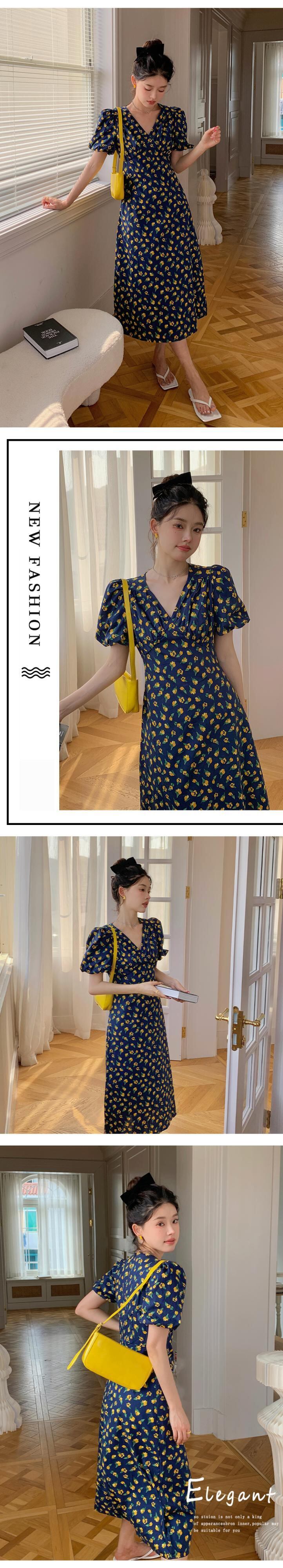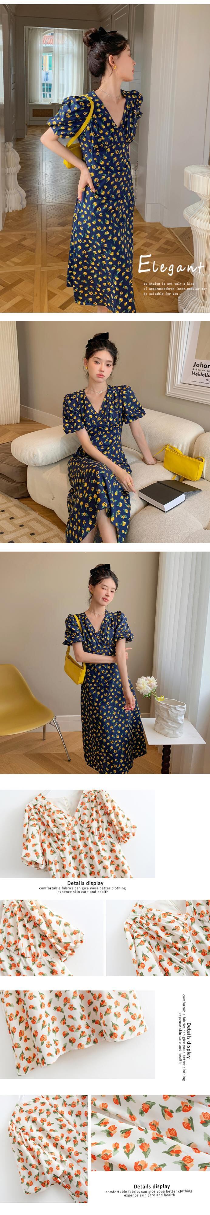 ラージサイズの女性の夏の新しいフレンチ気質Vネックフローラルパフスリーブドレス女性のシックなウエストティーブレイクドレス qmn16659660553