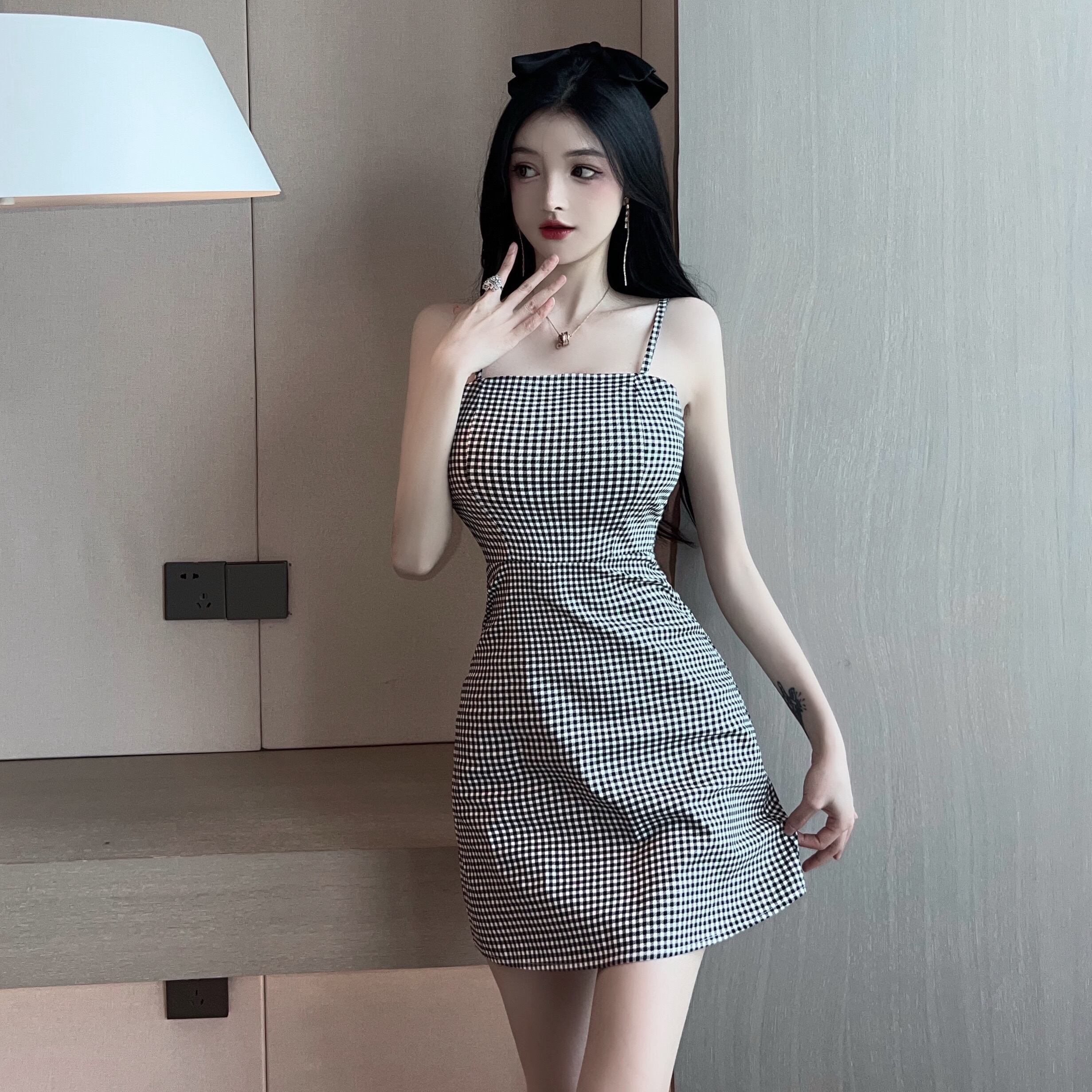 チェック柄サスペンダースカートレディースサマーアウターウェアレトロ気質セクシースリムスリミングショートパッケージヒップドレス micat14267561760
