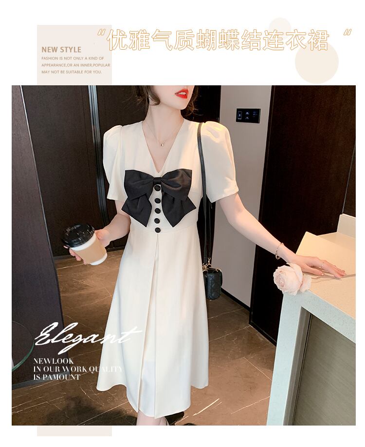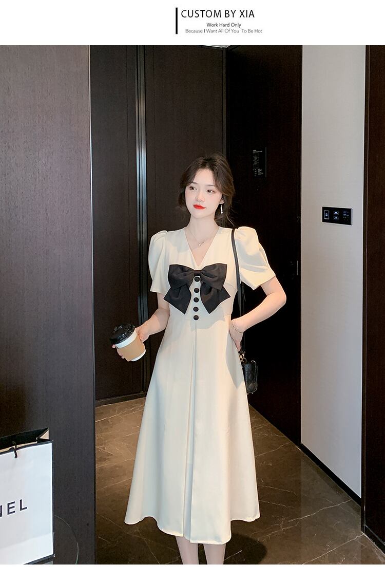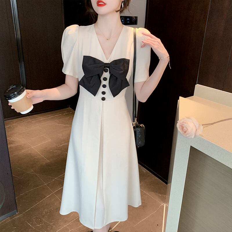 夏の新作レトロVネックボウAラインスプリットラージスウィングドレスレディースハイウエストミドル丈気質スカート qmn24781769996