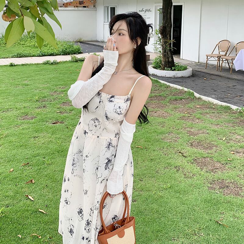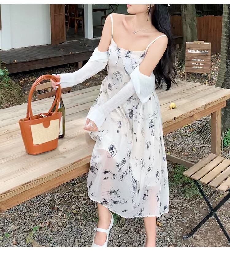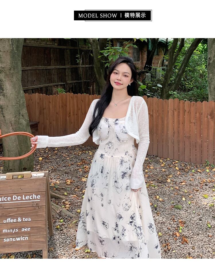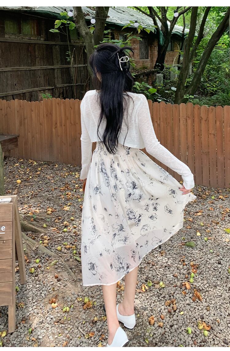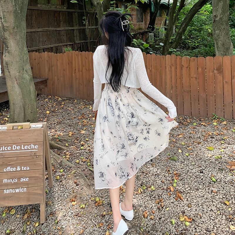 夏の新作スタイルの気性優しい風ショートニットカーディガン+Vネックハイウエストプリントサスペンダースカートスーツタイド qmn40198434029