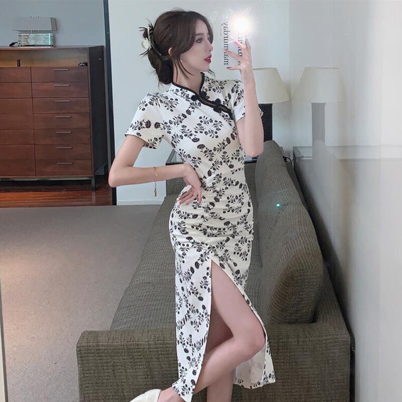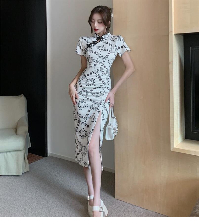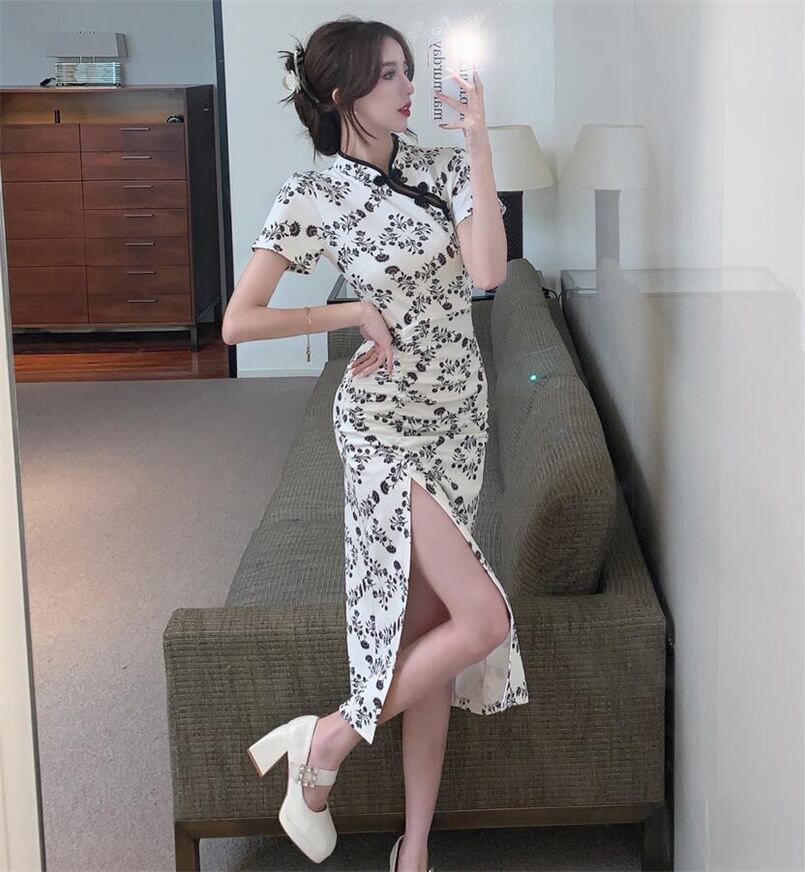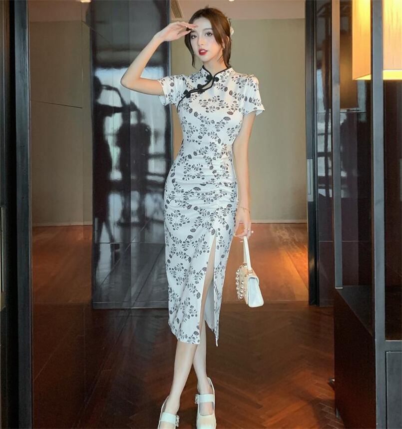 チャイナスタイルの改良されたチャイナドレスの女性の夏の若い気質のハイエンドレトロフローラル半袖ミドル丈ドレス micat93830406703