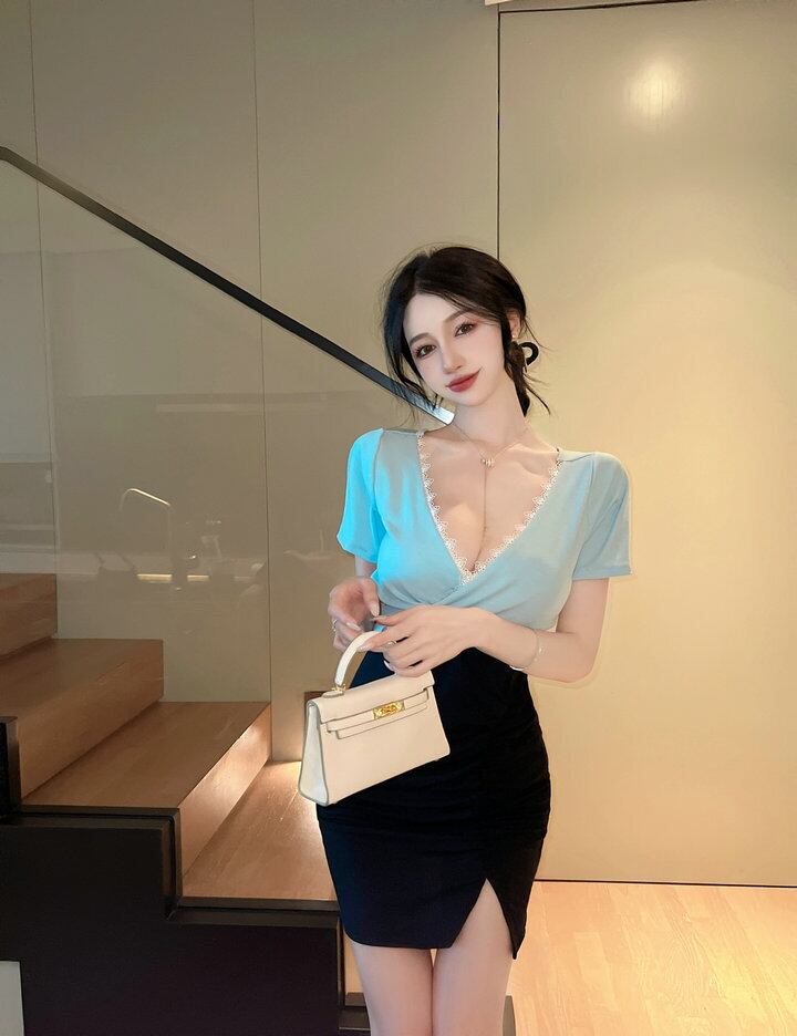 ナイトフィールドドレスナイトクラブ気質セクシークロスローカットディープVネックカラーブロッキング半袖スリムフィットヒップパックスカート micat23044114487