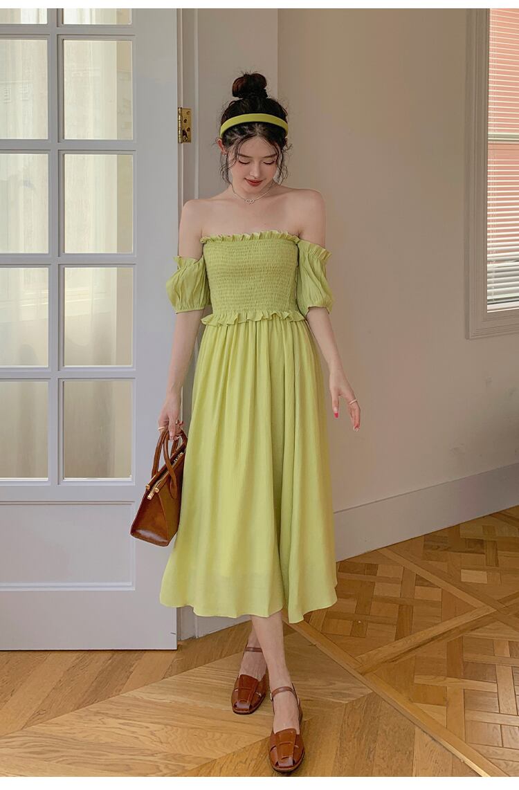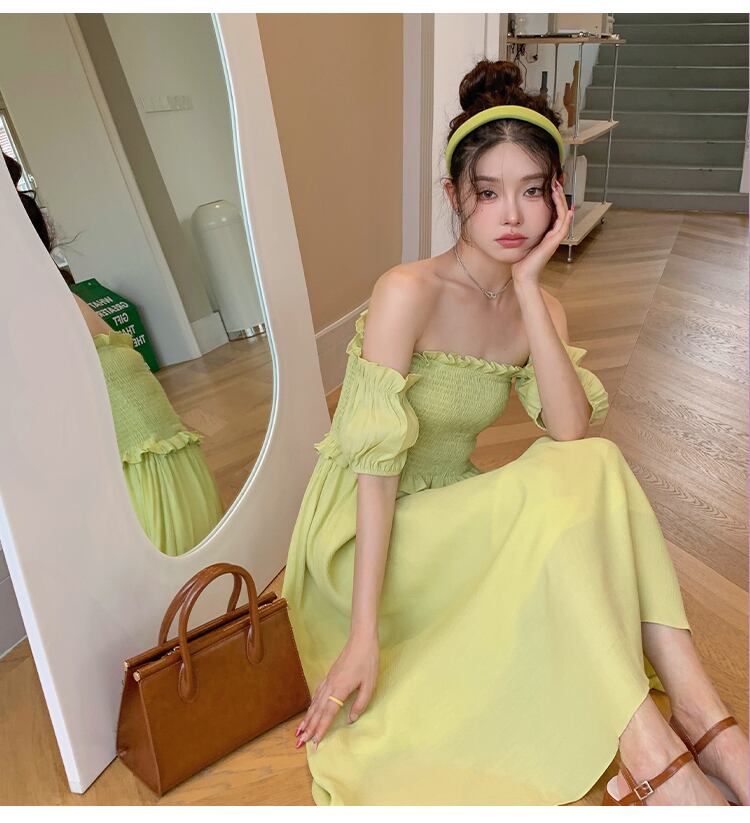 夏の新しいフランスの気質ニッチシックな甘い無地のレースオフショルダーウエストスリムドレス女性の潮 qmn42920201231