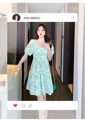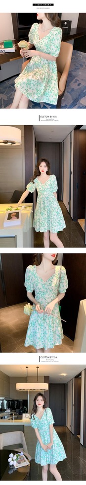 気質グリーンの夏の新しいスタイルバージョン小さな新鮮な光おなじみのスタイルVネックパフスリーブスリムハイウエストフローラルドレス qmn11509105476