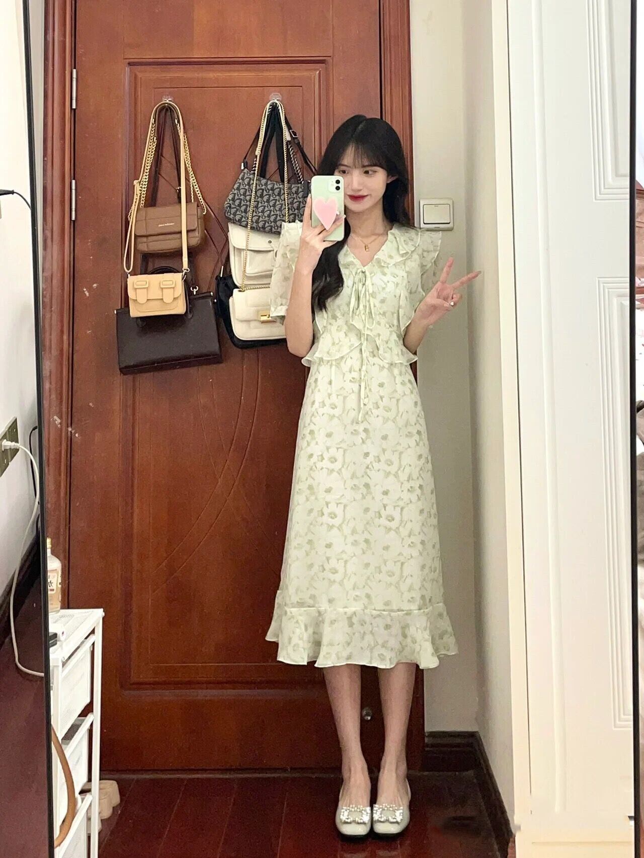 夏の優しい風フランスの純粋な欲望緑の花柄のドレススーパーフェアリーデザインニッチウエスト気質ロングスカート qmn98835203260