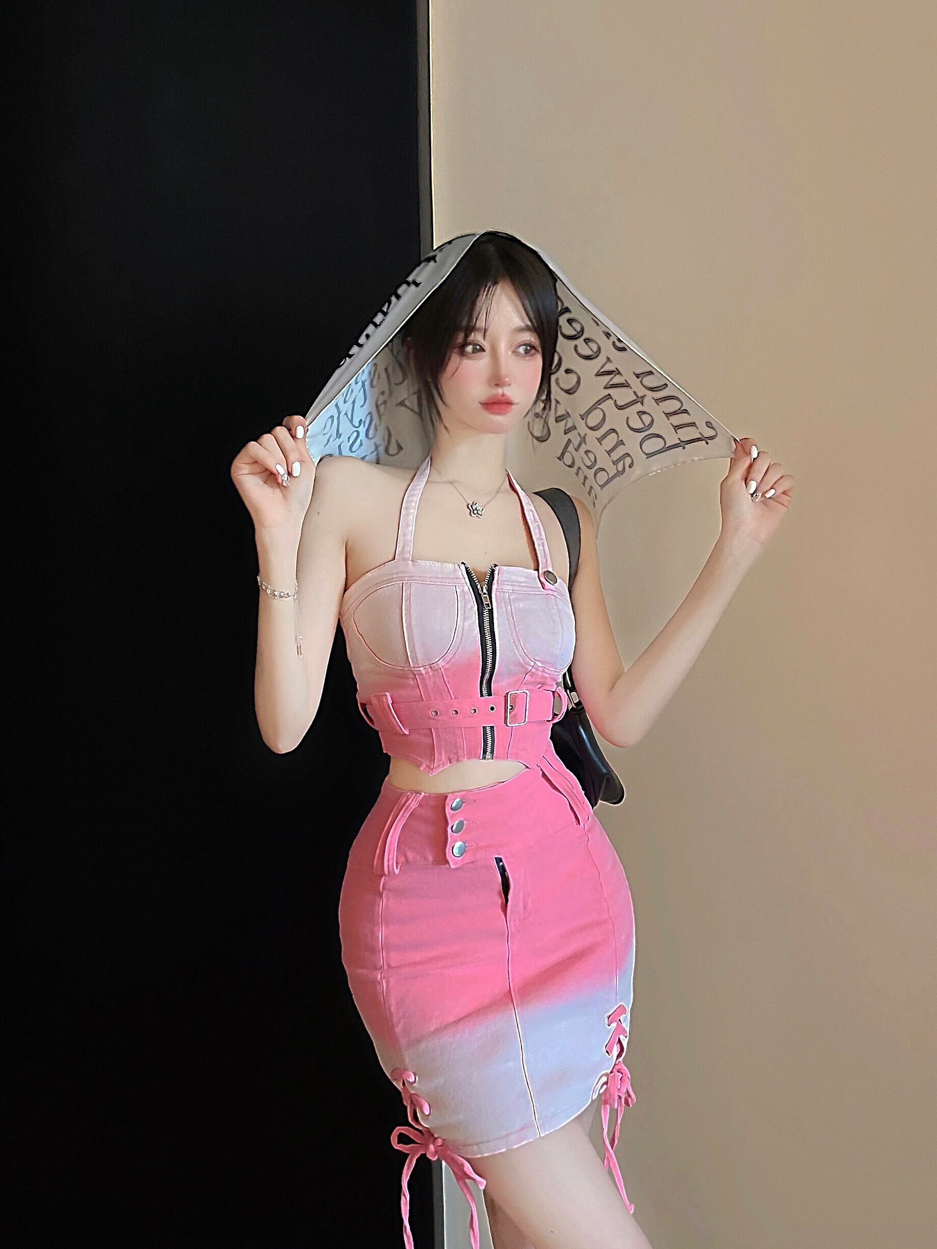 クールソルトウェアスーツレディースサマーグラディエントデニムセクシーサスペンダートップ+ショートスカートツーピースセット micat14584419838
