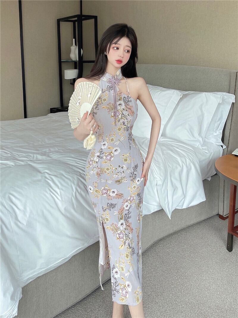 広州13行チャイナドレスイブニングドレス中国の改良版セクシーな傾斜襟オフショルダーミドル丈ホルタードレス micat7216764642