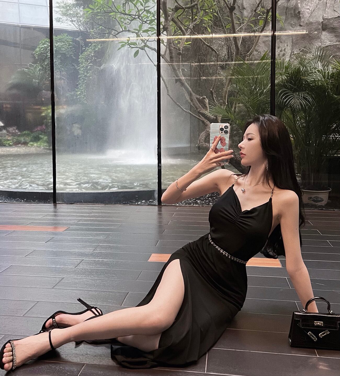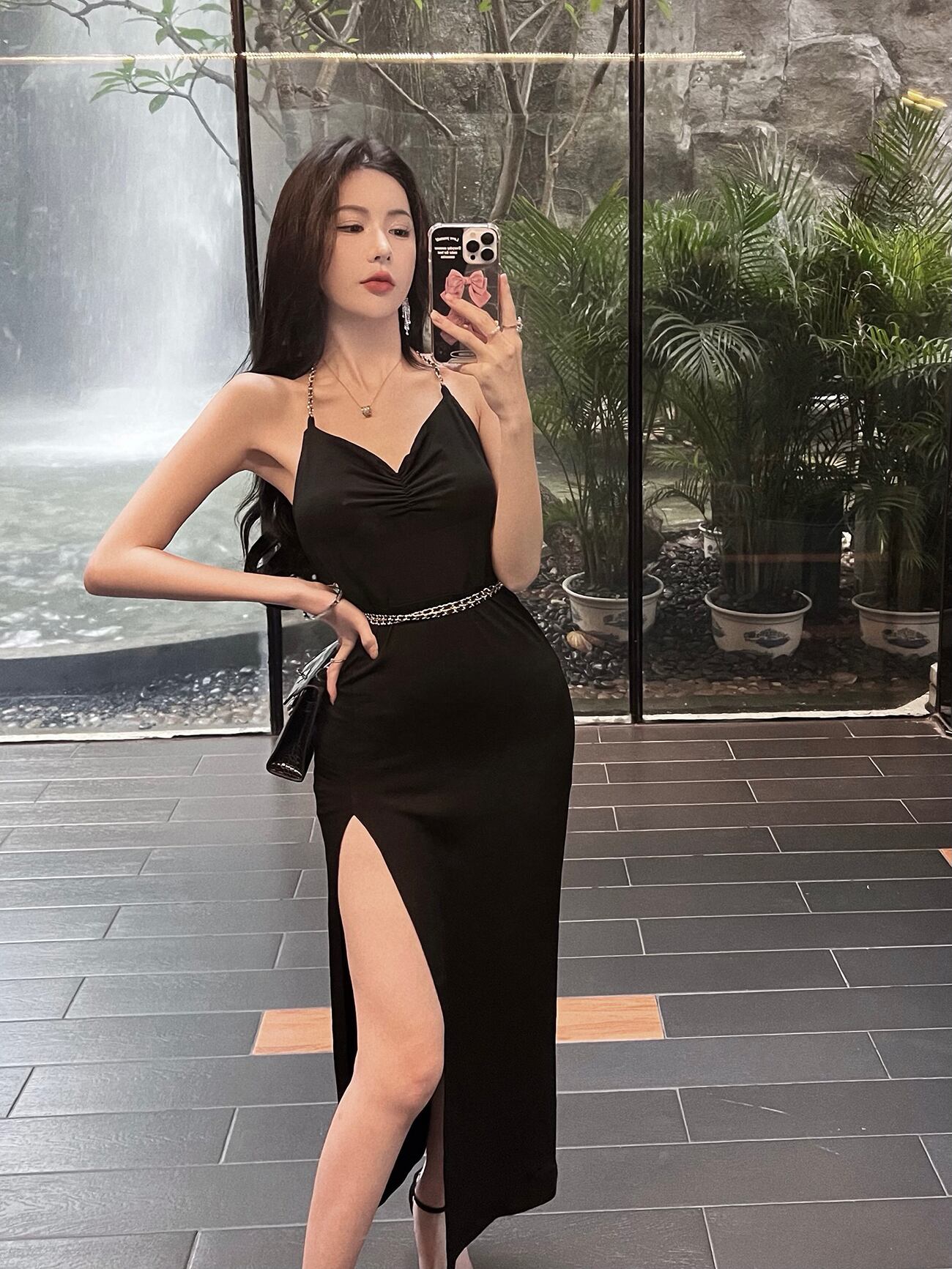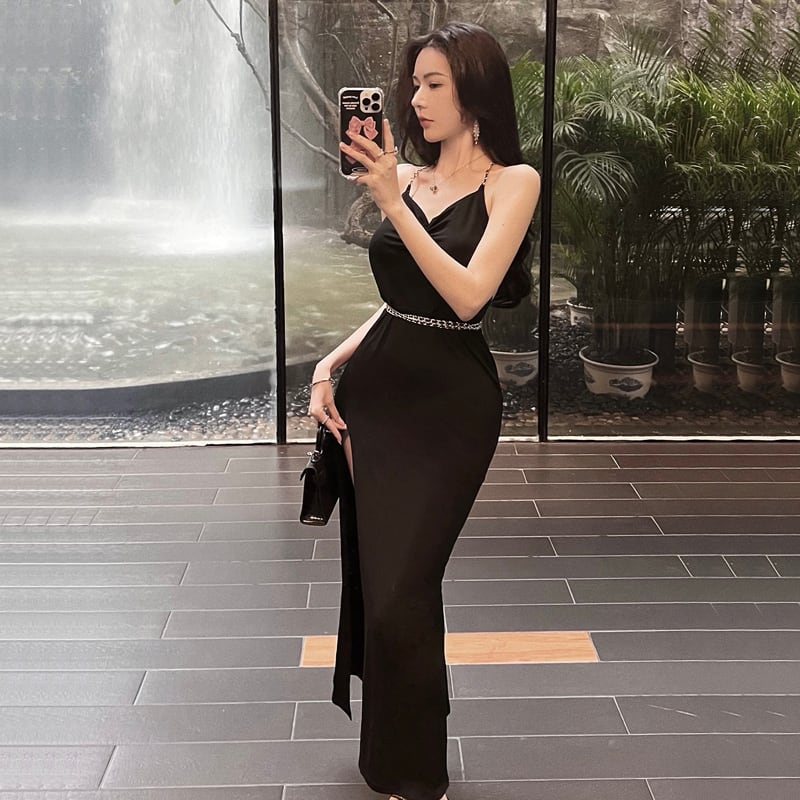 黒のイブニングドレスナイトショップ婦人服宴会気質セクシーなVネック大オープンバックスリムチェーンホルタードレス micat23587538311