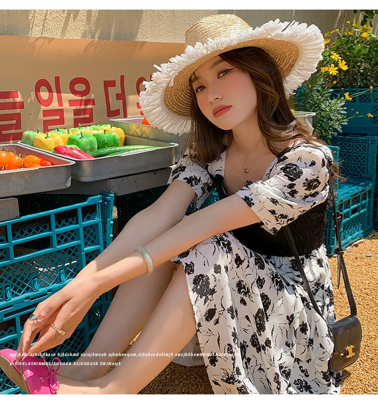 夏の新バージョンファッション気質やや太いMMフレンチカビエッジスクエアカラーローズプリントロングドレスメス qmn46592334092