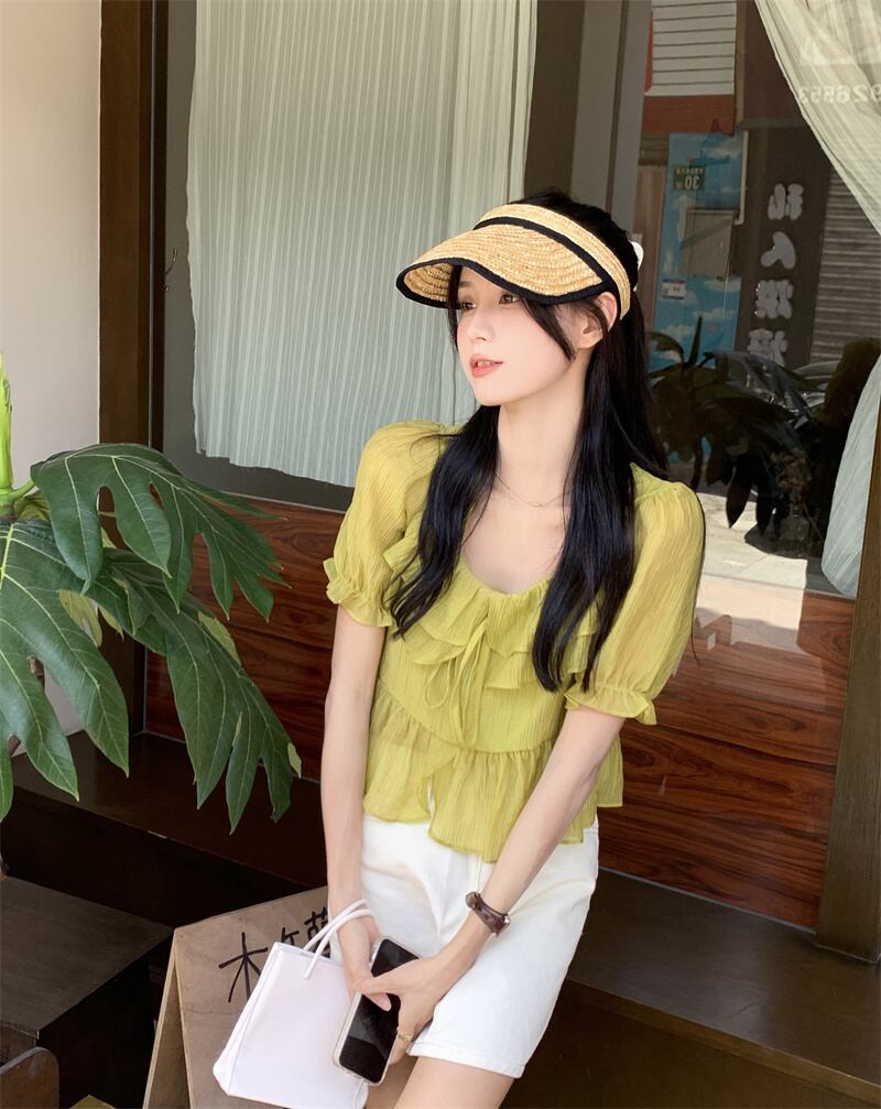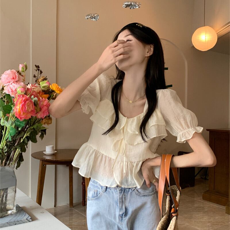 夏の新作スタイルファッションデザインセンススクエアネックタイパフスリーブシャツフリルエインスタイル小さめシャツタイド qmn49054995117
