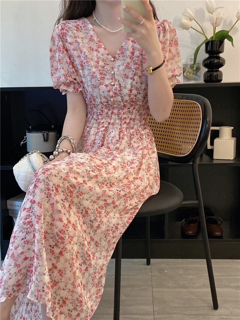 夏の新気質シックな花柄シフォン ドレス レディース パフ スリーブ V ネック ウエストが細かったオーバー ニー スカート トレンディ qmn85665269305