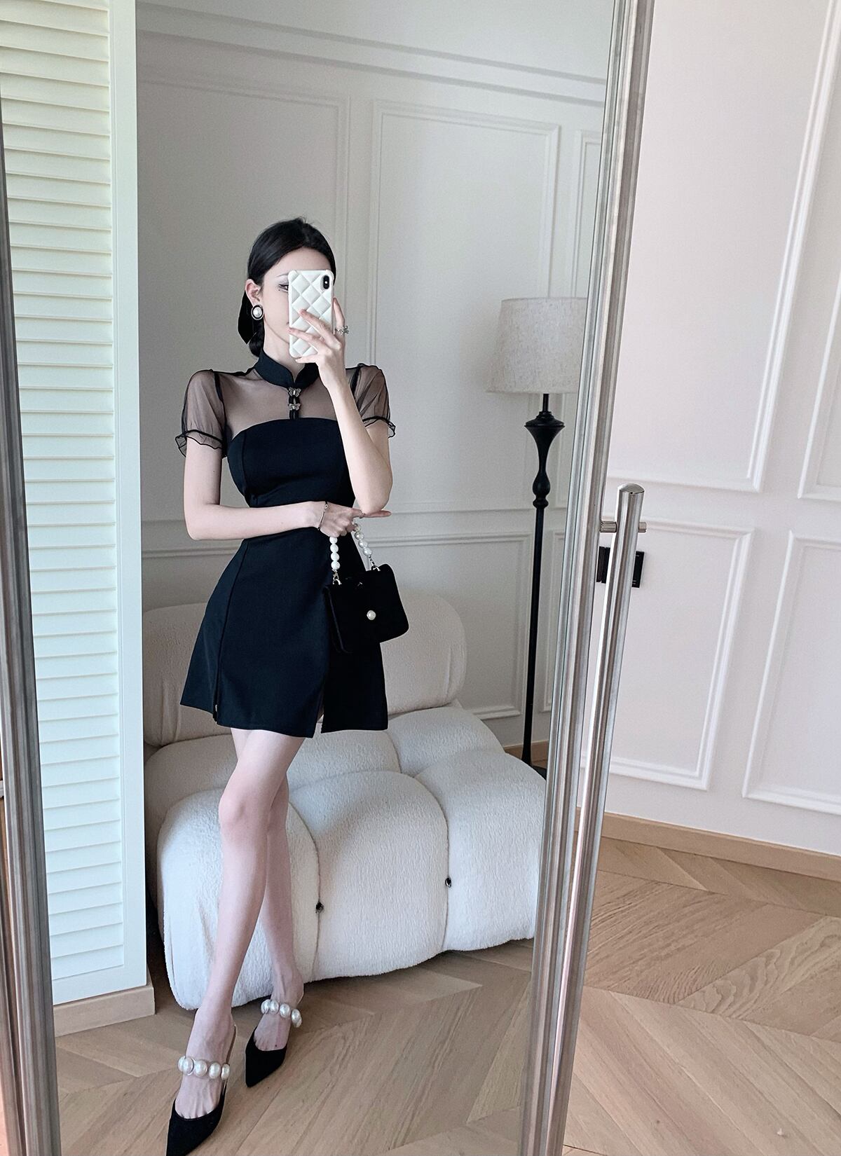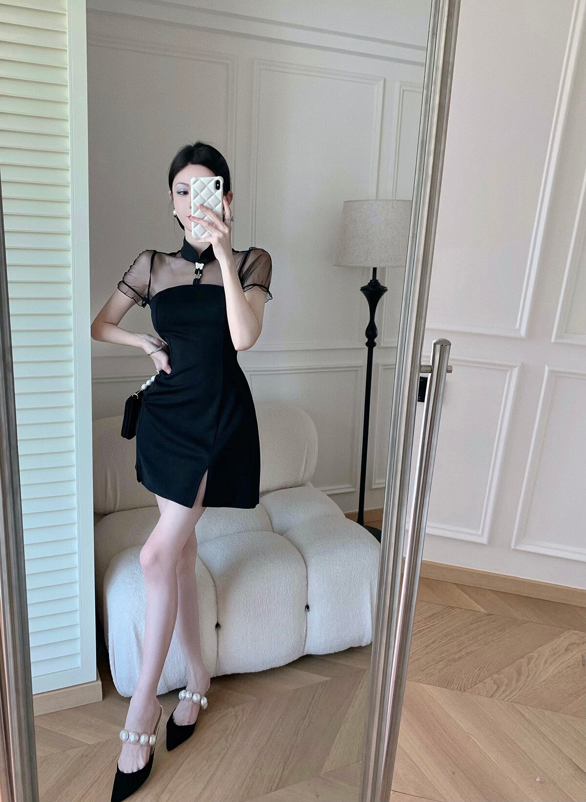 中国風の改良された黒のチャイナ ドレス 2022 新しい夏の若いセクシーなメッシュ ステッチ ドレス micat92315707612