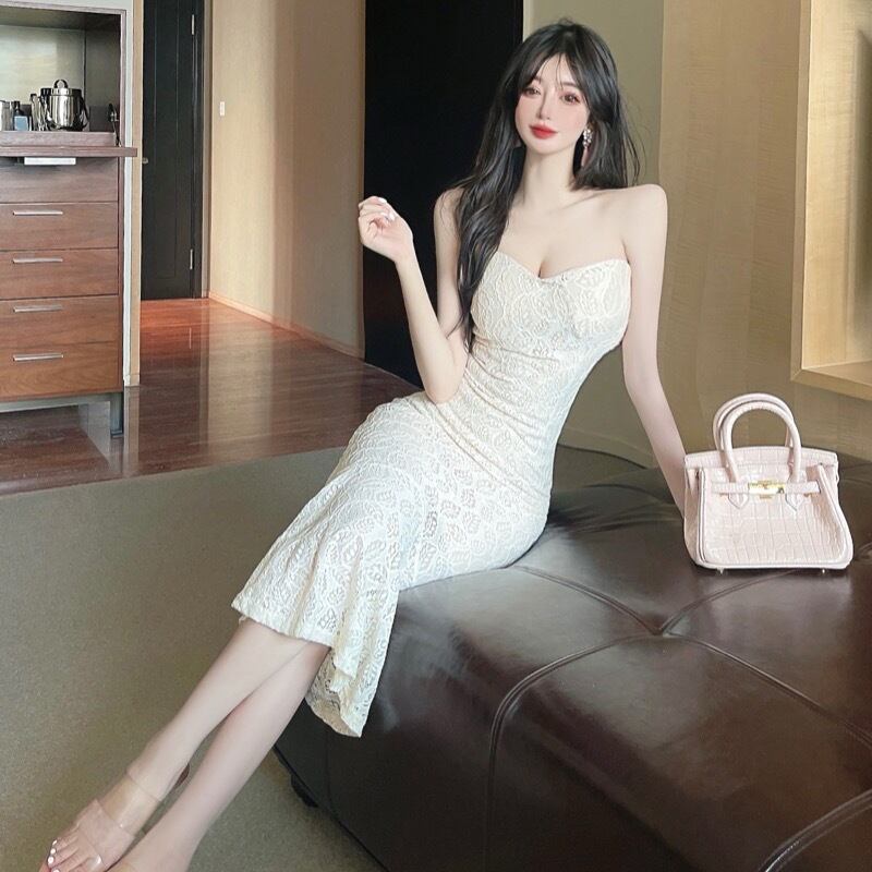 イブニングドレスハイエンドライトラグジュアリーニッチバンケット気質セクシーなローカットディープVネックミッドレングスレースチューブトップドレス micat86097319554