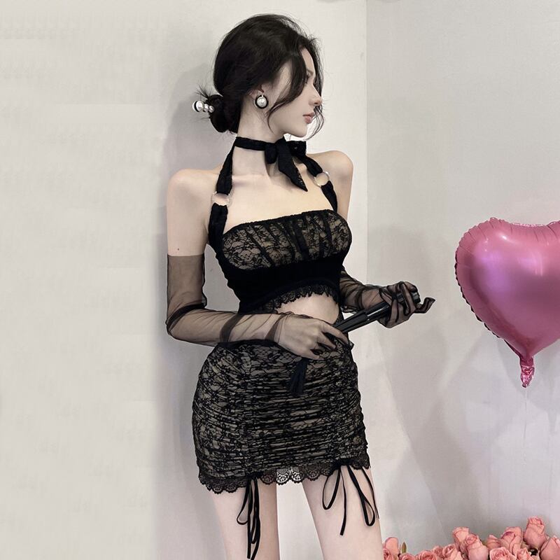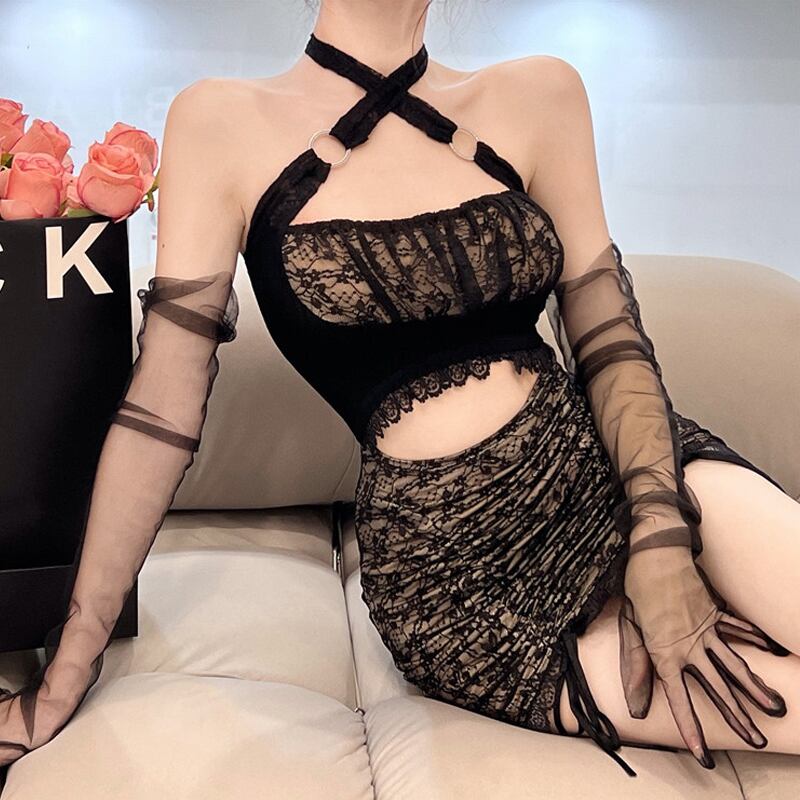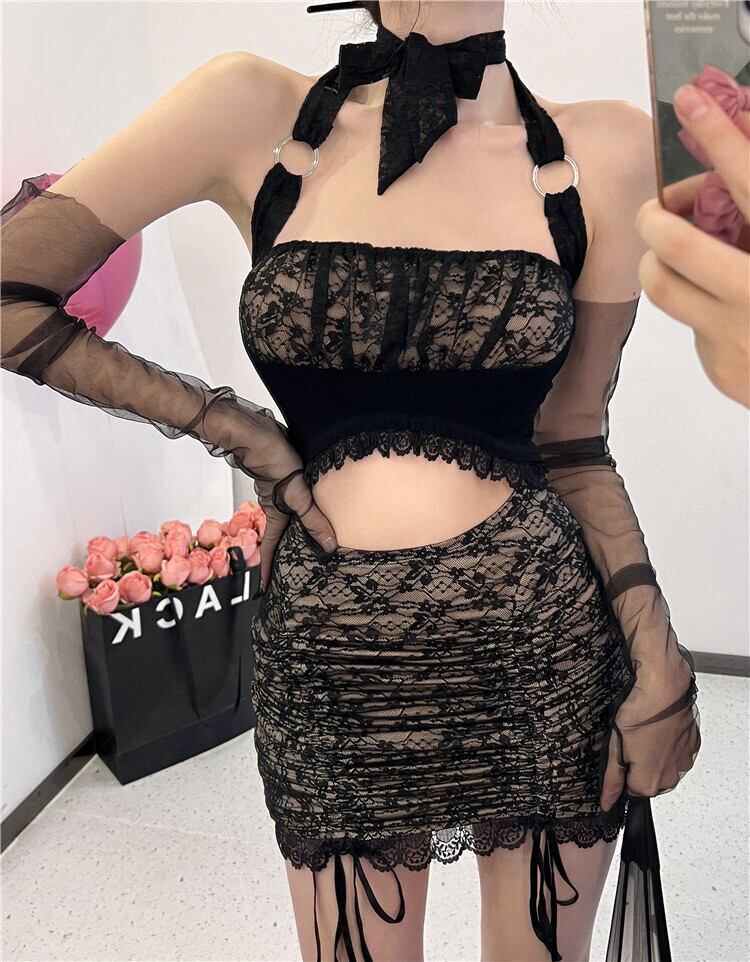ナイトクラブの女性のファッションデザインセンスニッチセクシーな中空アウトウエストレースホルターネックバッグヒップサスペンダードレス micat32105597569