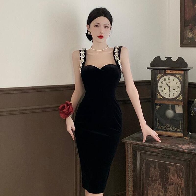 ヘップバーン スタイル イブニング ドレス スカート フェミニン気質ライト高級ニッチ ハイエンド フレンチ セクシー ブラック ゴールド ベルベット サスペンダー ドレス micat8010708642