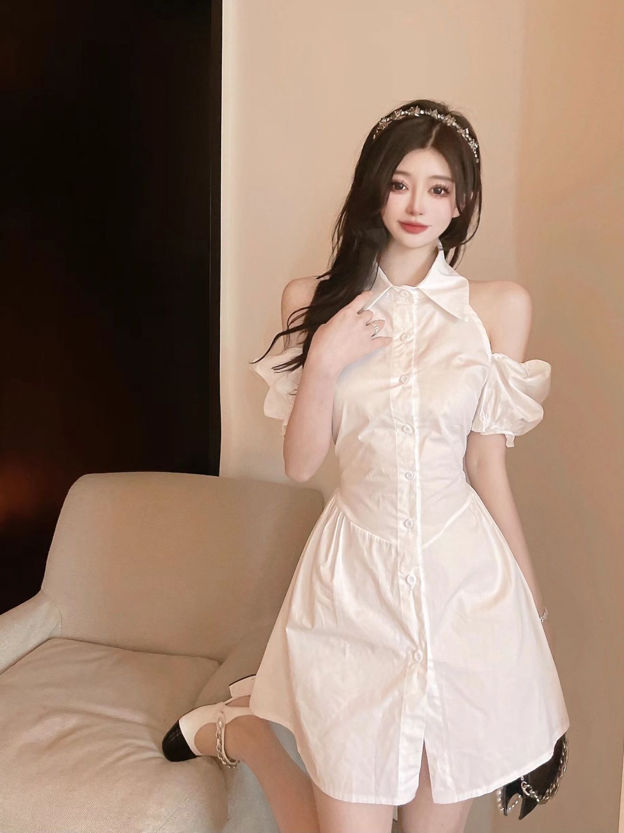 ニッチなウエストと細身のフレンチパフスリーブがセクシーなオフショルダーのホルターネックワンピースの夏らしいデザインの白シャツスカート micat93648508250