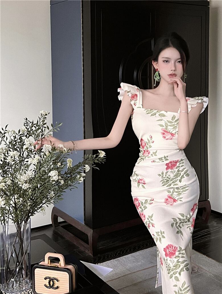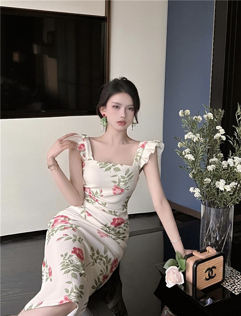 サスペンダー スカート夏の女性の 2022 新しいフランスのレトロなプリント気質ハイエンド小さなフライング スリーブ ミッドレングス ドレス micat54578940591