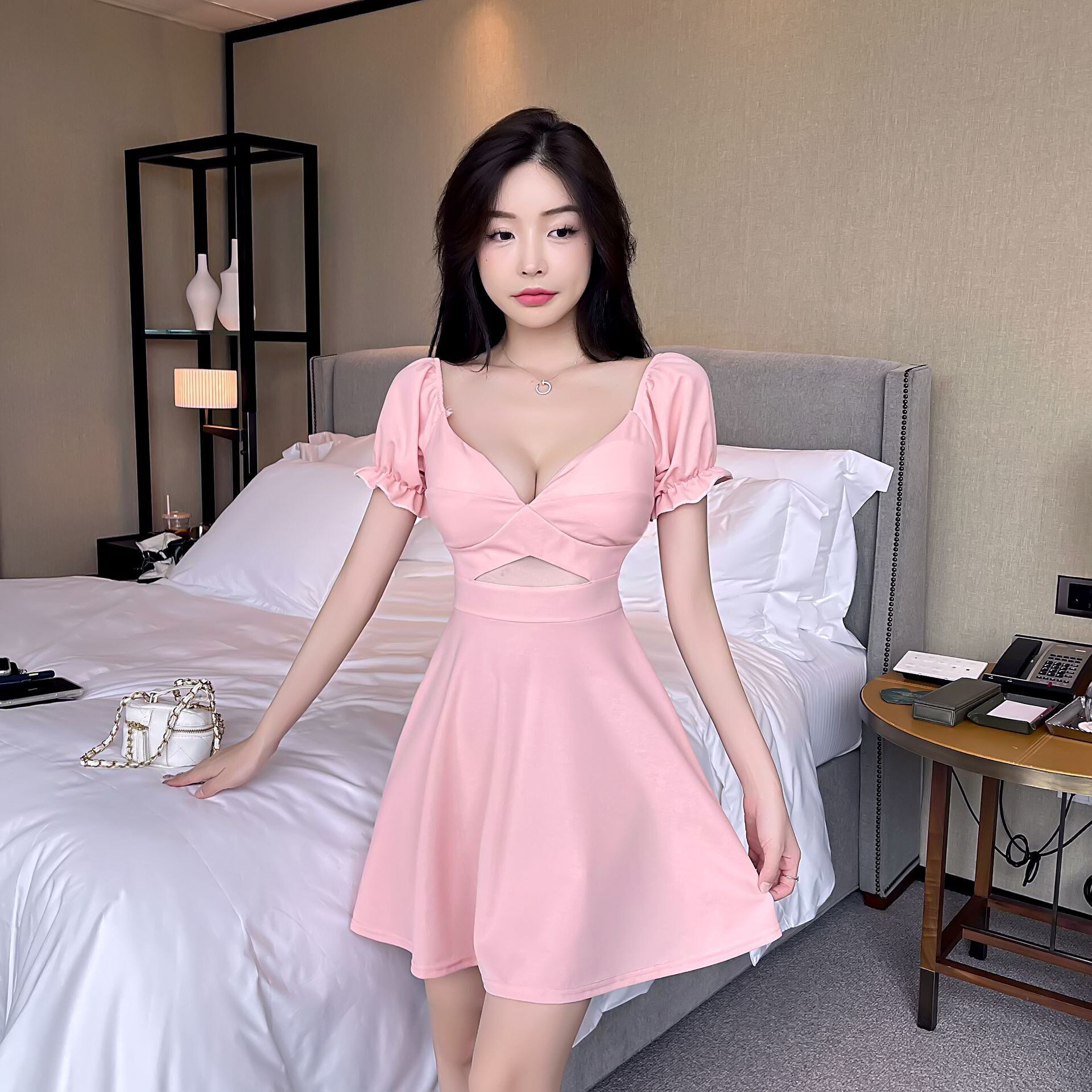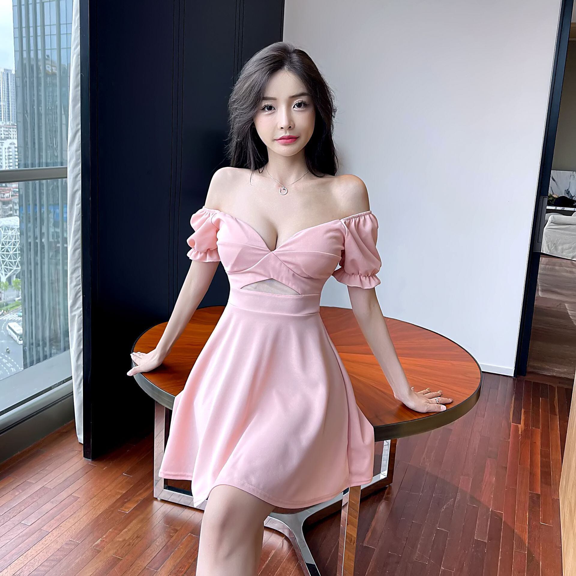 ナイトクラブのナイトクラブの女性のフレンチパフスリーブのセクシーなローカットの深いVネックのメッシュステッチウエストとスリムなドレス micat91641713173