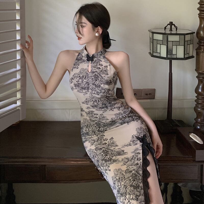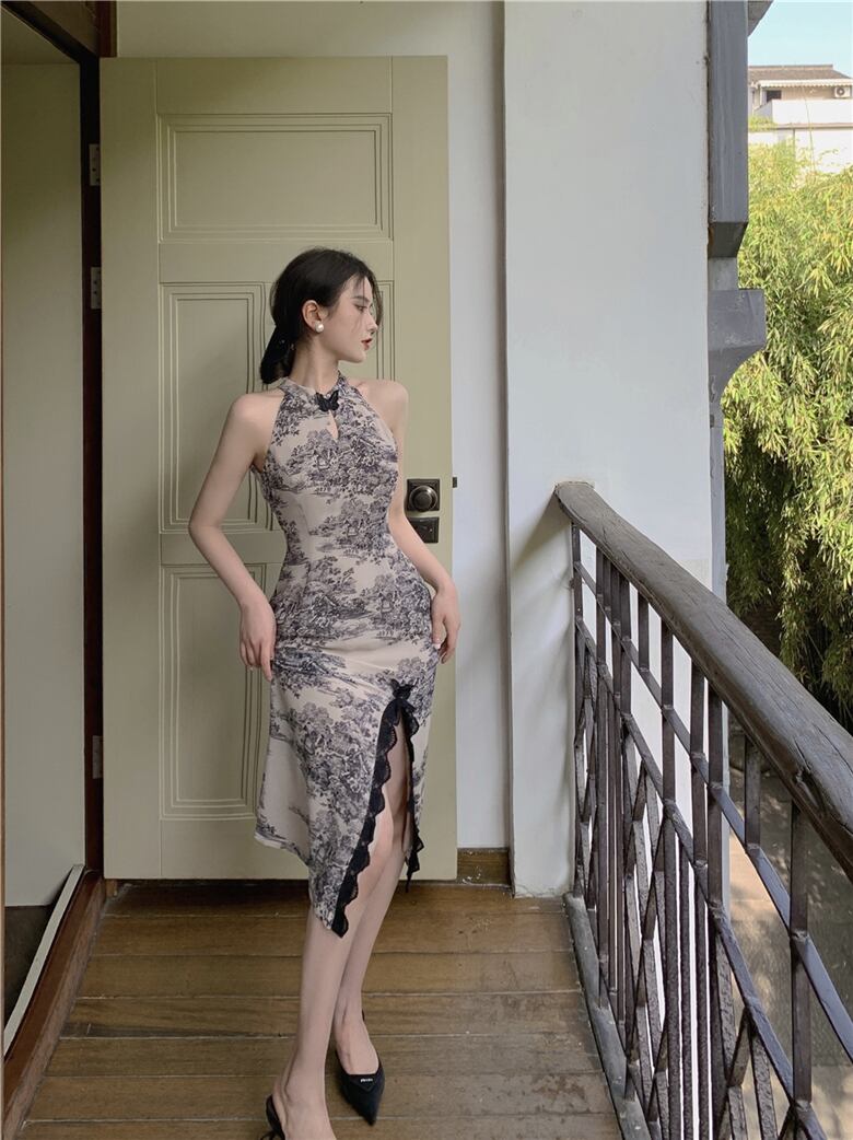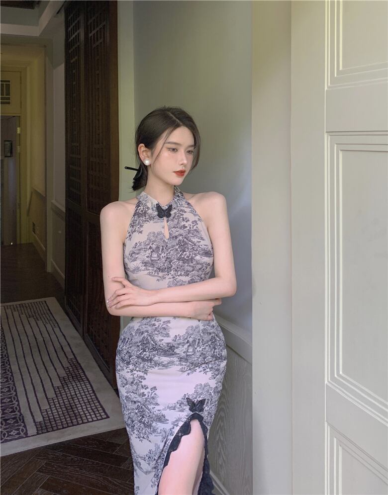 中国のチャイナ ドレス イブニング ドレス若い気質ハイエンド気質セクシーなオフショルダー ミッドレングス ホルター ドレス micat5639425344