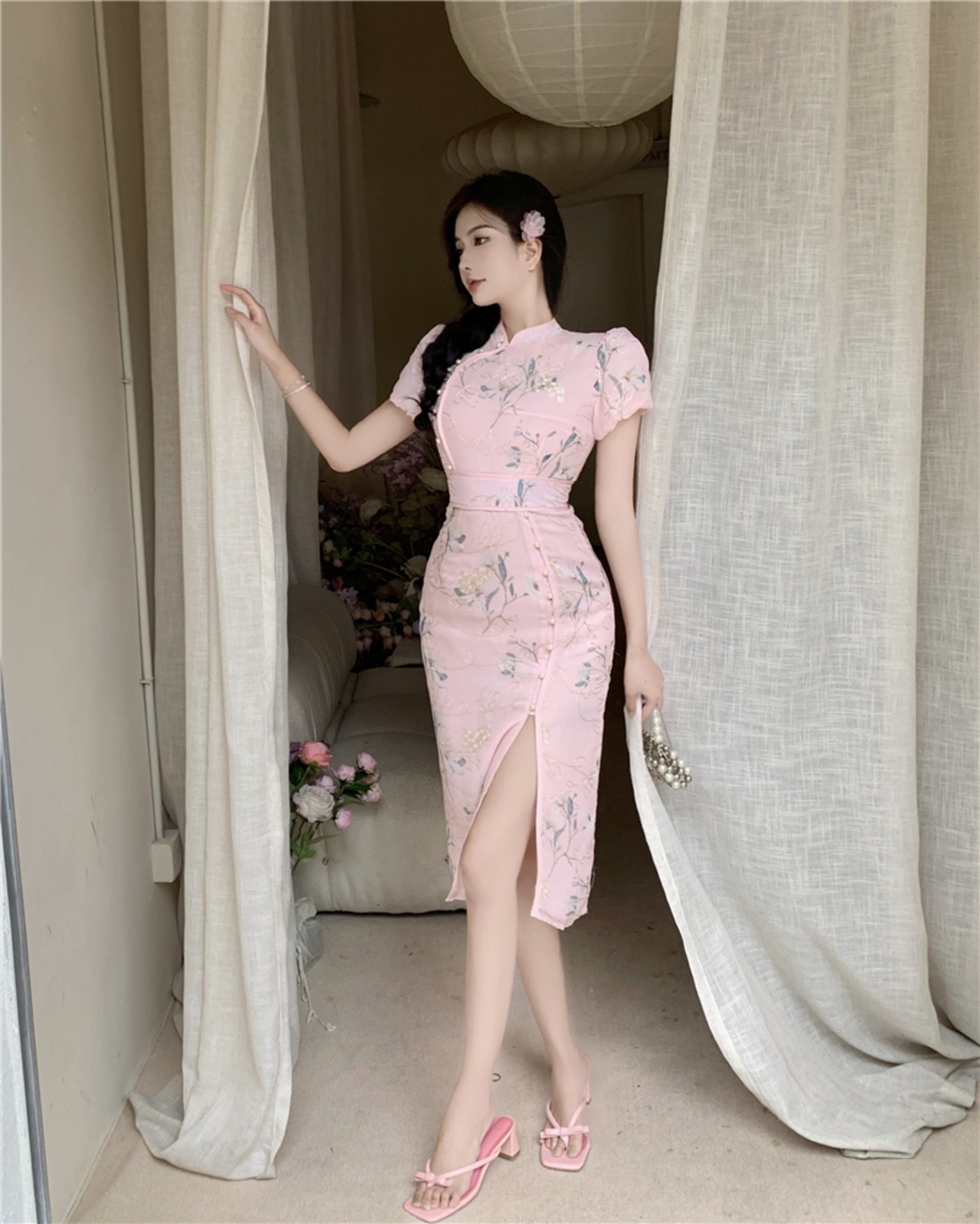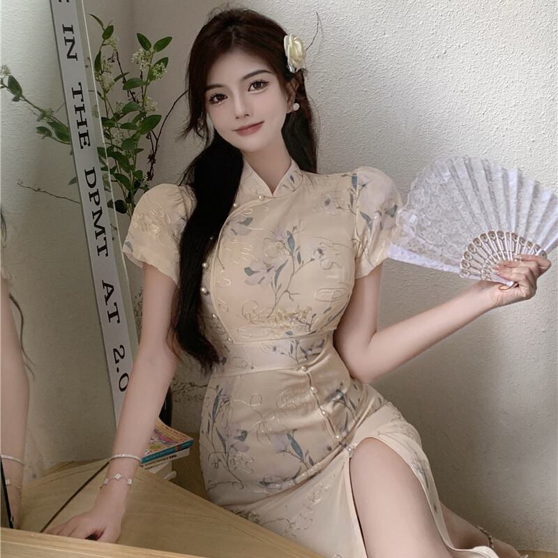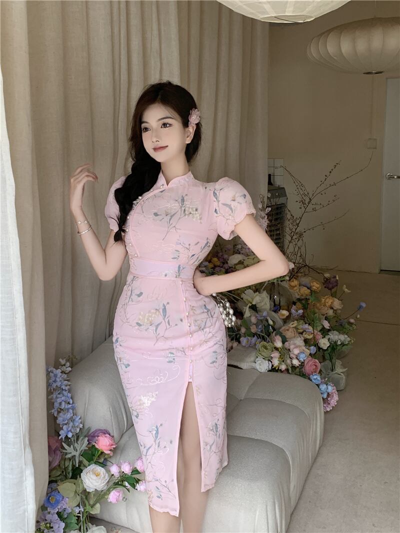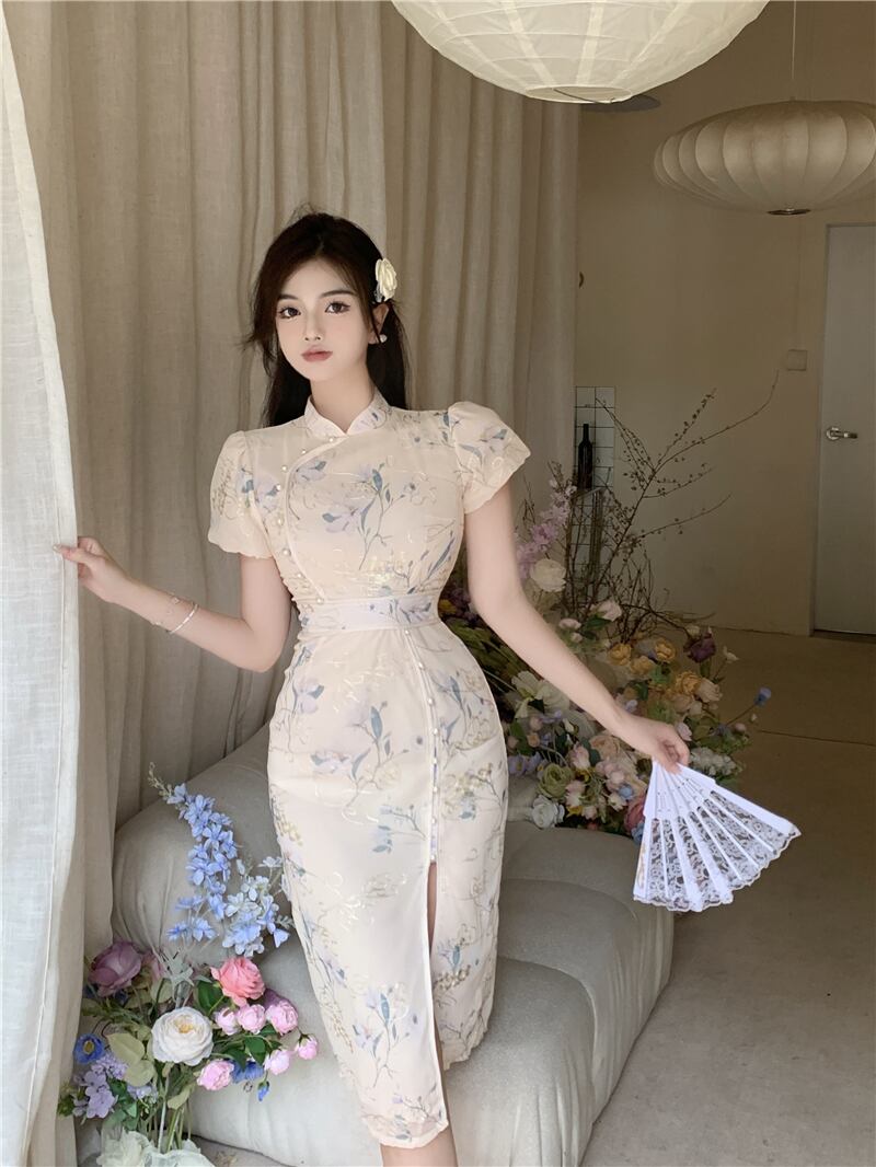 改善されたチャイナ ドレス若い気質ハイエンド ファッション レトロ フレンチ パフ スリーブ ミドル丈ドレス micat1164280237
