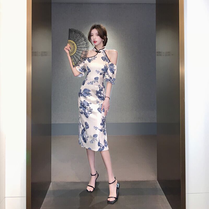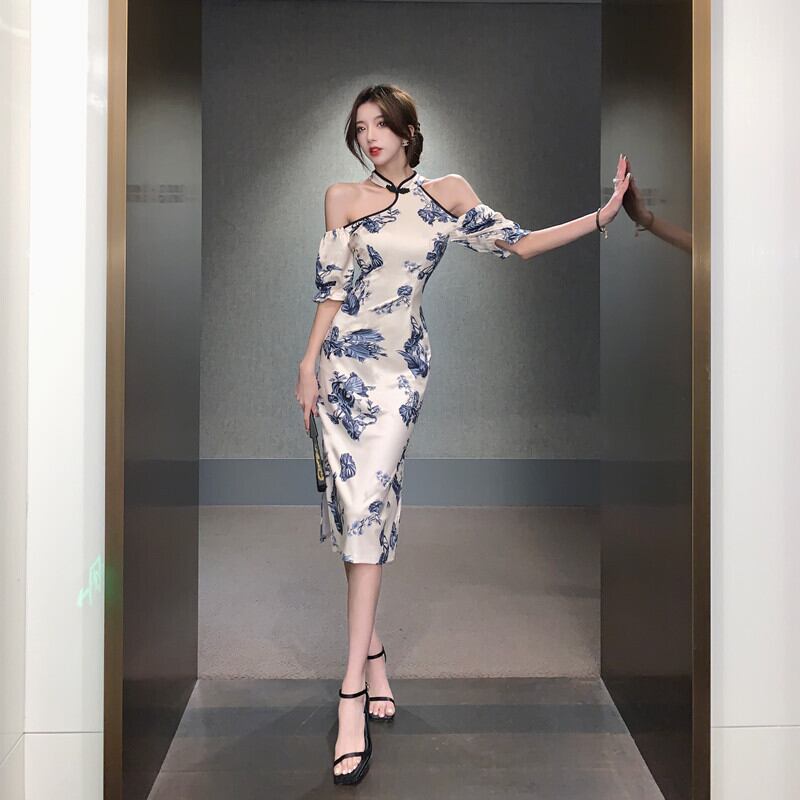 チャイナ イブニング ドレス ハイエンド ライト ラグジュアリー ニッチ 中国風の青と白の磁器プリント セクシーなオフショルダー ミッドレングス ドレス micat22742752906