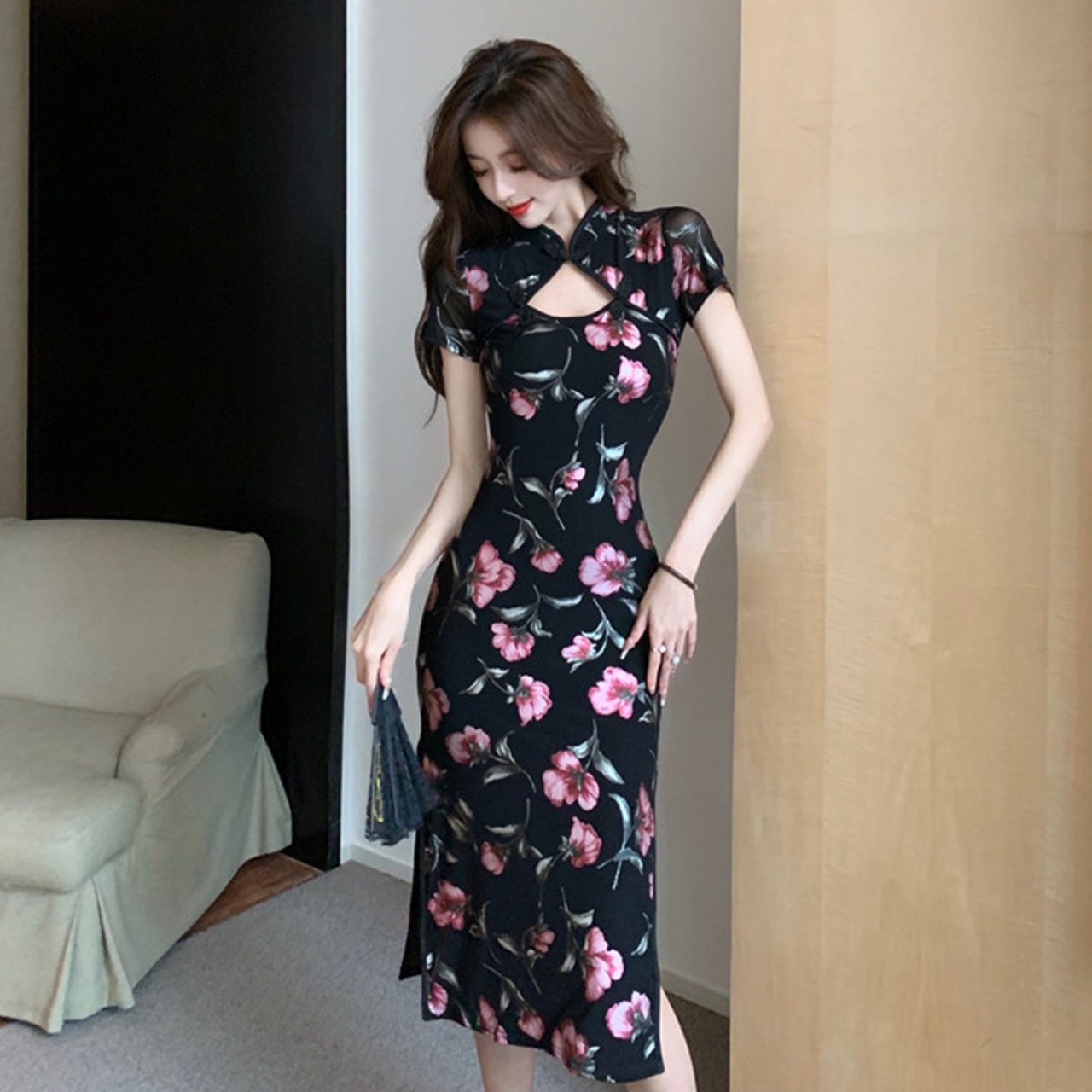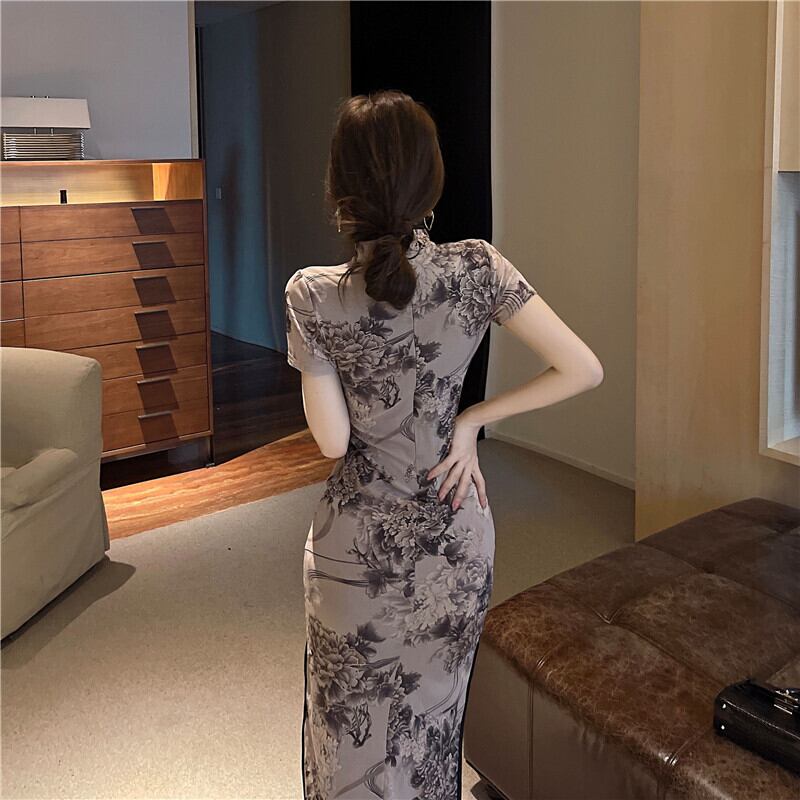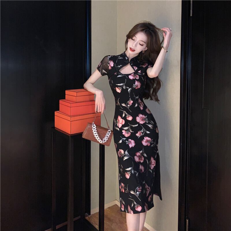 中国の改良されたチャイナ ドレス 2022 若いレトロなプリントのセクシーな中空ロング ドレス micat98928326230