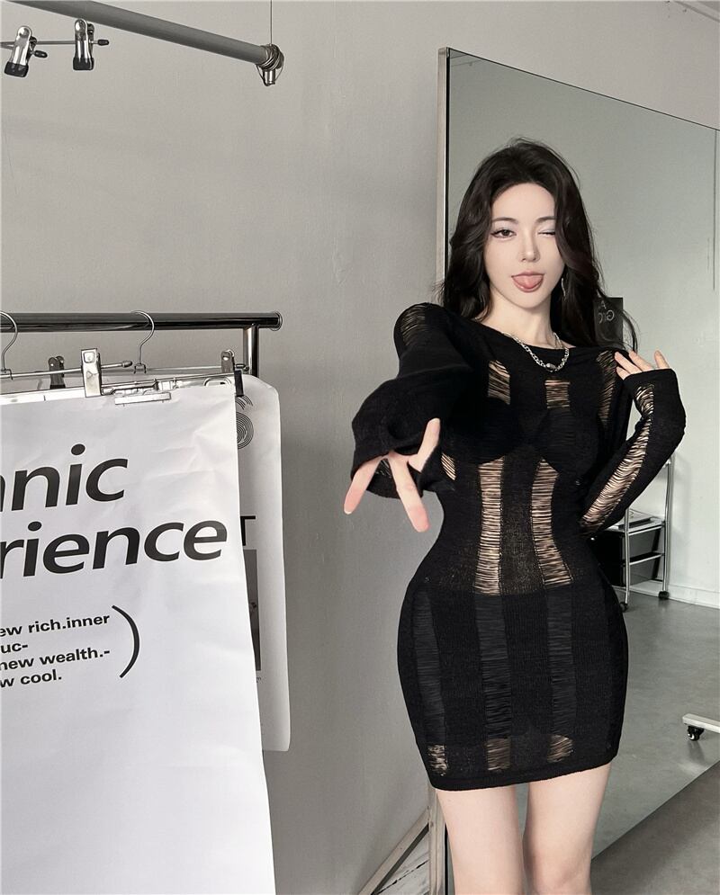 ナイトクラブの女性のバーディスコリトルブラックドレス女性の初秋のセクシーな中空穴背中の開いた長袖ヒップドレス micat22892297216