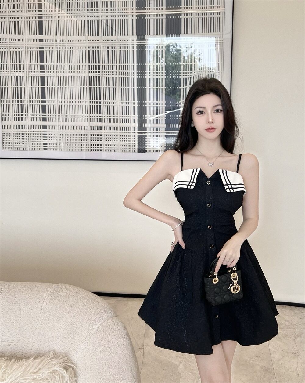 フランスのヘップバーン スタイルのリトル ブラック ドレス悪魔スカート女性の夏のハイエンドの黒と白の綴りウエスト受信薄いサスペンダー ドレス micat91588418444