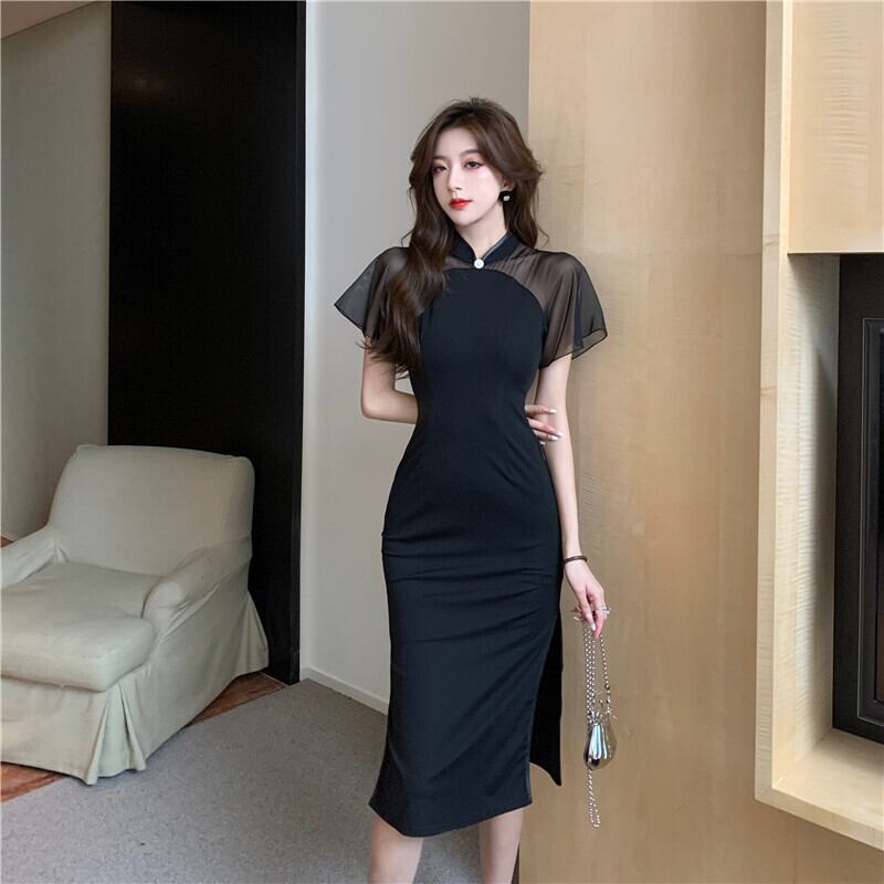 黒のチャイナ ドレス 2022 新しい若いスタイルの改良版の気質のセクシーなメッシュ ステッチ ミドル丈のドレス micat20198516321