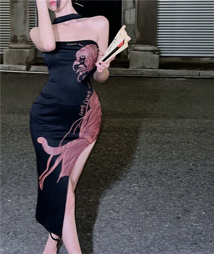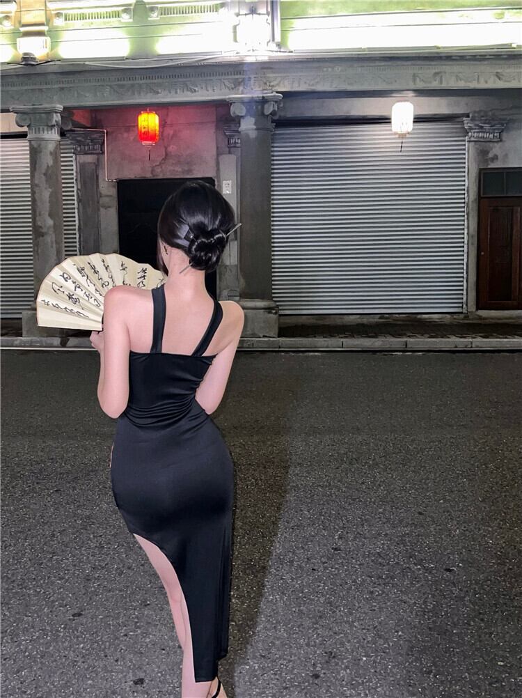 黒のイブニング ドレス ハイエンド ライト高級ニッチ ナイトクラブの女性の中国風のセクシーなワンショルダー ホルターネック チューブ トップ ドレス micat25819588517